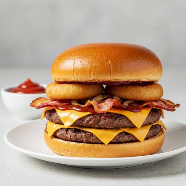 Dos carnes smashed y sazón de la casa, queso americano, salsa bbq, 2 aros de cebolla, tocino y cebollas asadas, sobre pan brioche tostado.
