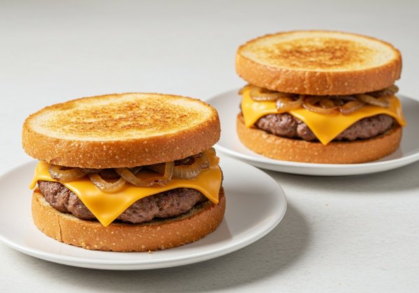 3 rebanadas de queso americano crujientes a la plancha y cebollas asadas sobre un panecillo invertido tostado.