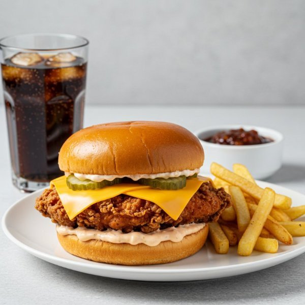 Jugosa pechuga crujiente apanada con especies de la casa, dos rebanadas de queso americano y pepinillos, en un delicioso pan de papa con aderezo de la casa.