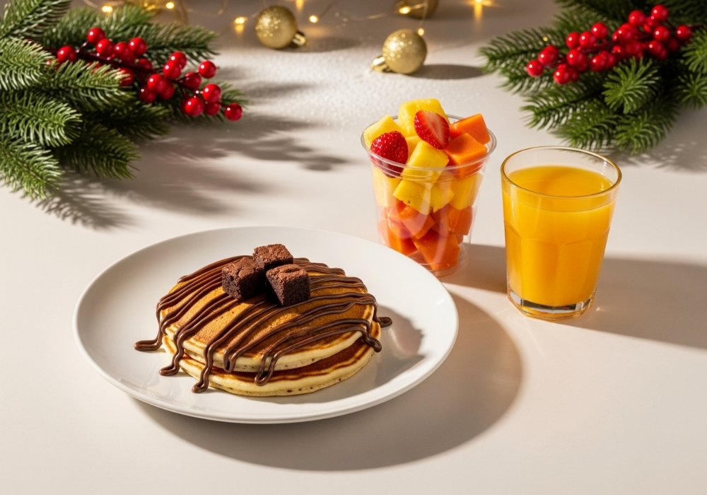 Combo que Incluye Pancakes de Brownie y Nutella, una porción de fruta y un jugo de naranja.