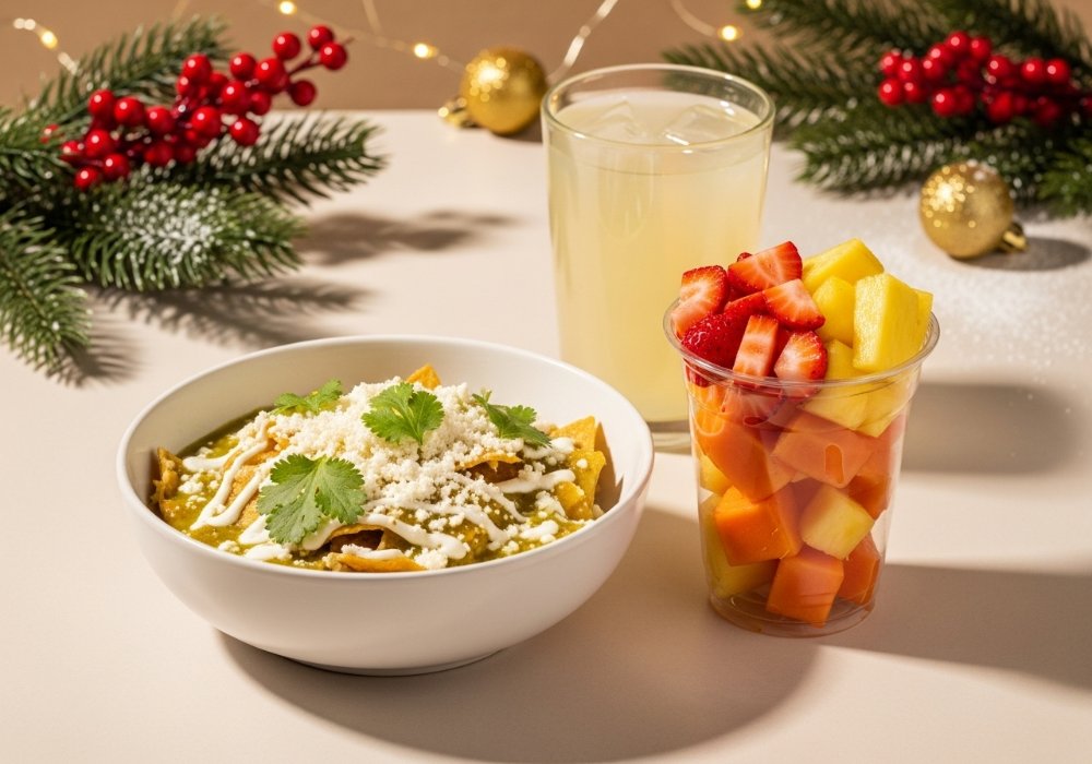 Combo que Incluye Chilaquiles verdes (con crema, cebolla y queso), una porción de fruta y una limonada.