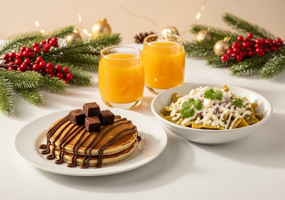 Combo que Incluye Chilaquiles verdes (con crema, cebolla y queso), Pancakes de Brownie y Nutella y 2 jugos de naranja..