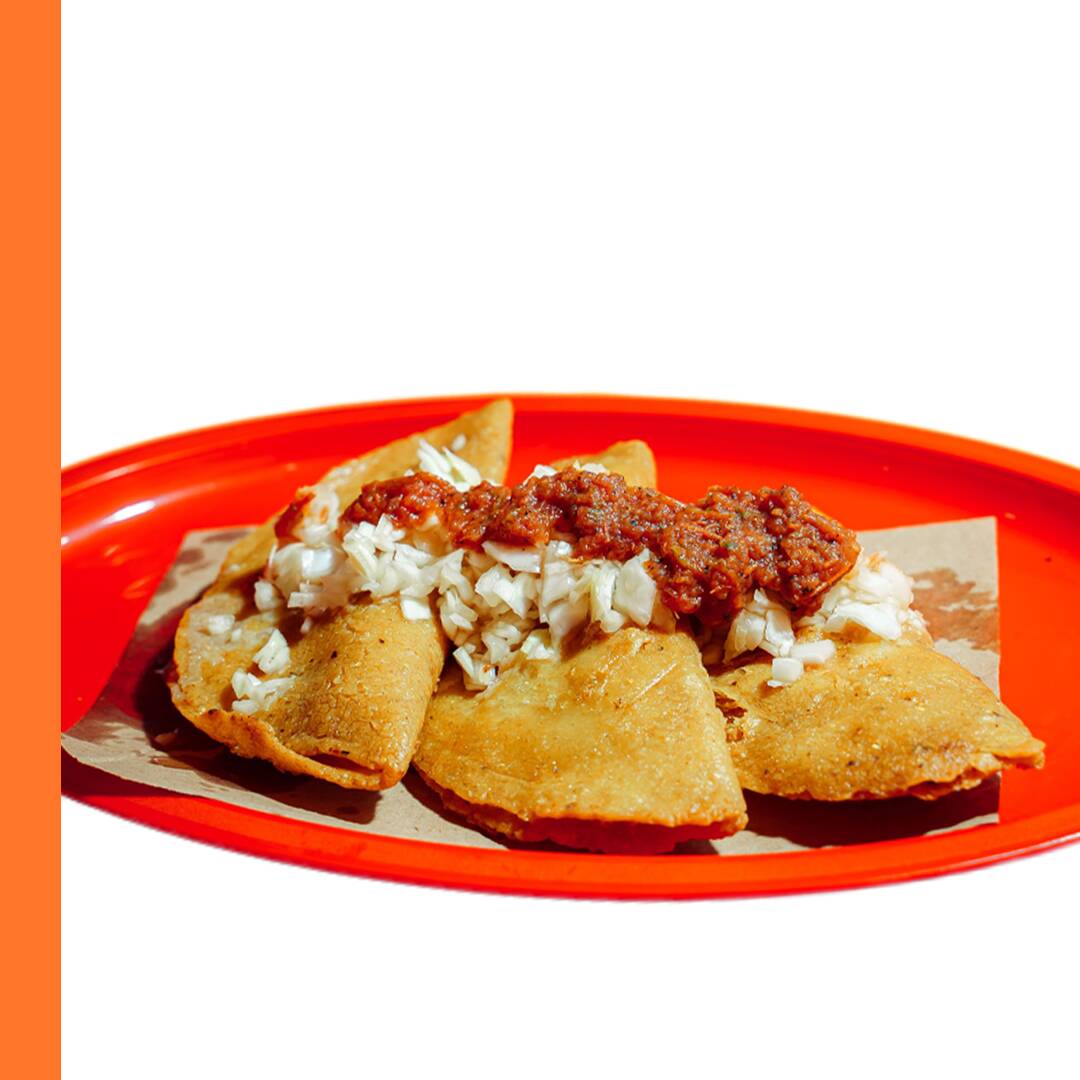 Doblada frita rellena de cochinita pibil con cebolla morada.