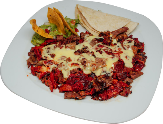 Deliciosa selección de carne de pastor y arrachera gratinada con queso envuelta en tortilla de harina.