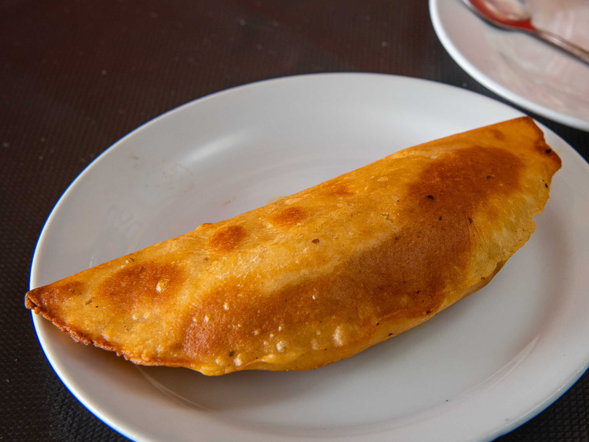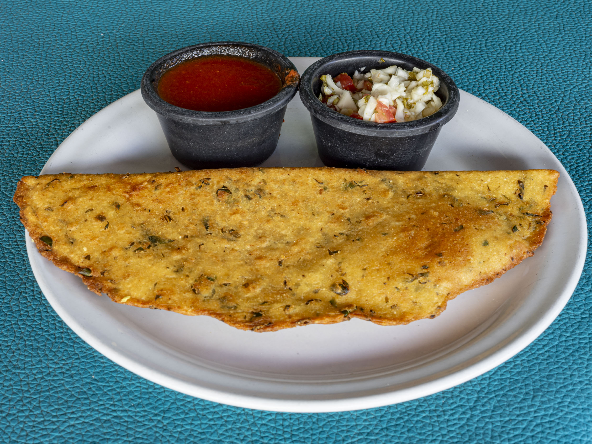 Empanda extra grande acompañada con salsa de tomate y pico de gallo