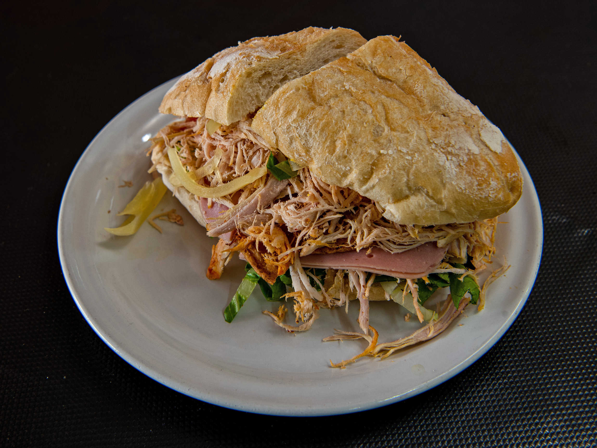 Pan de bolillo acompañado de pavo, cebolla, aguacate,lechuga y tomate.