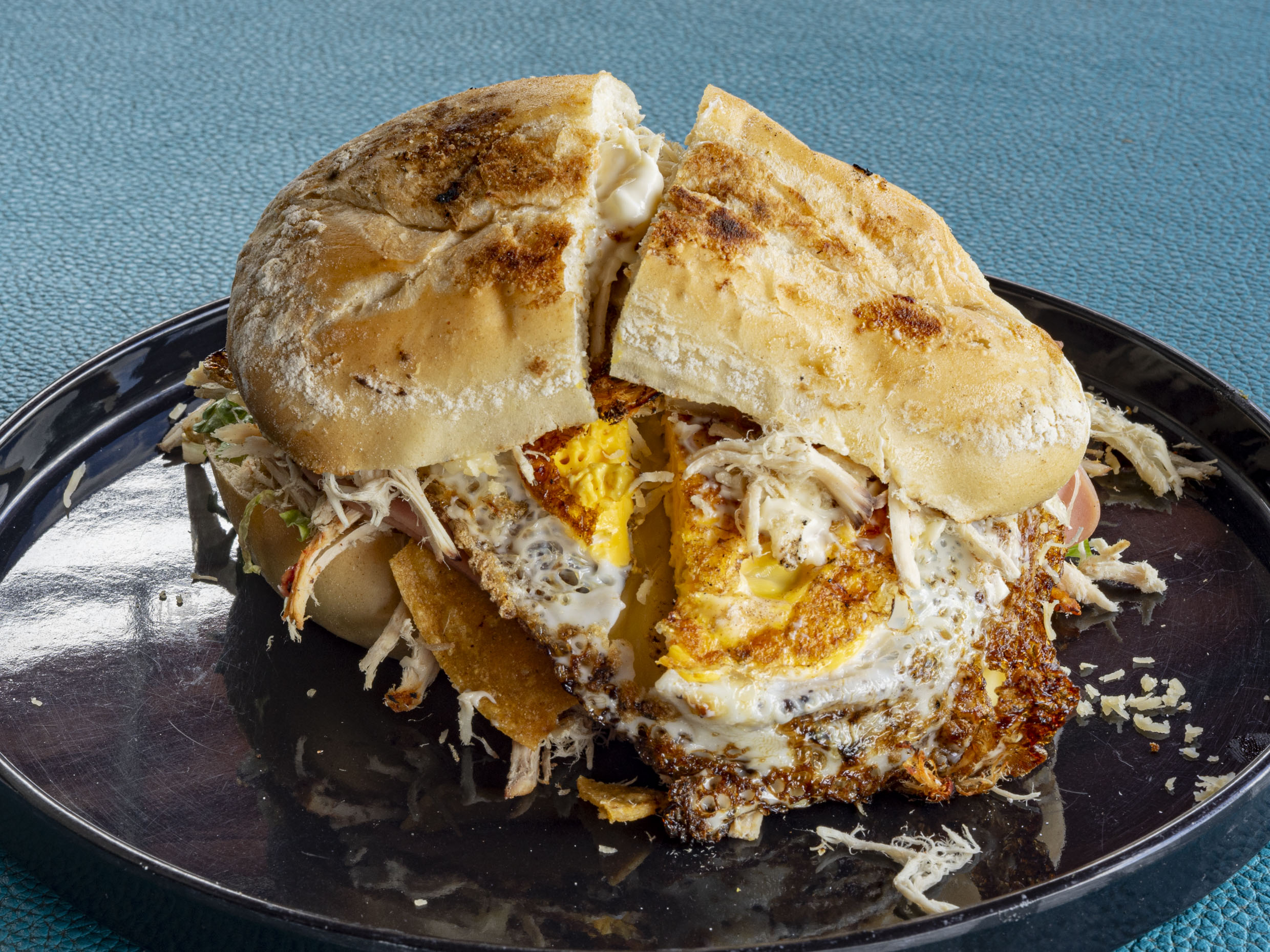 Pan de hanburguesa, jamón, queso, pavo, vegetales, mayonesa y una tostada al centro.