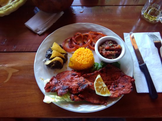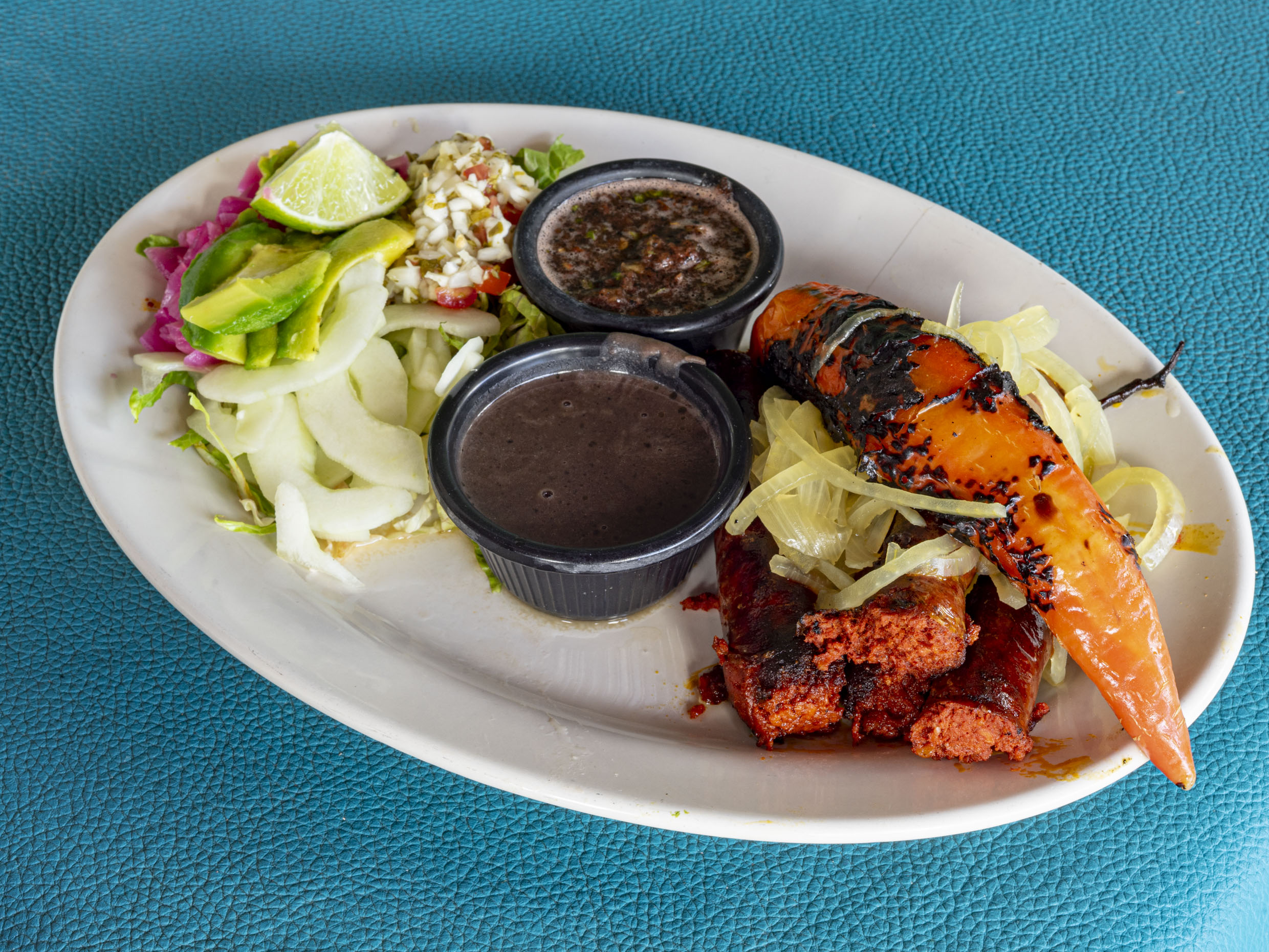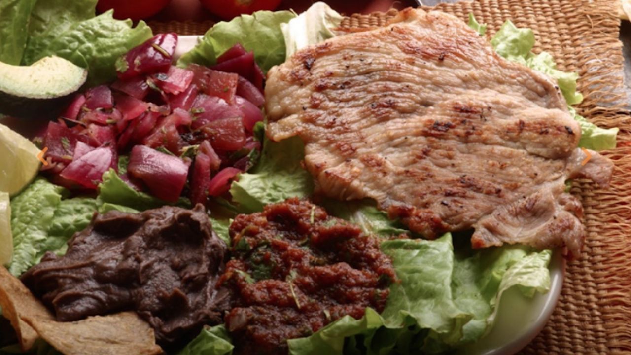 250 gr. de carne cerdo bañada en achiote al carbón acompañada de cebolla asada, vegetales, frijol colado y tortillas.