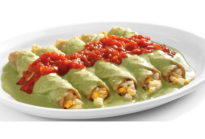 5 Tacos de huevo bañados en salsa de pepita de calabaza y salsa de tomate.
