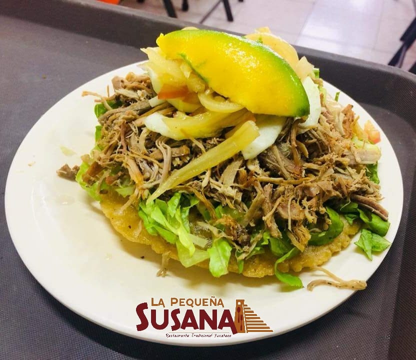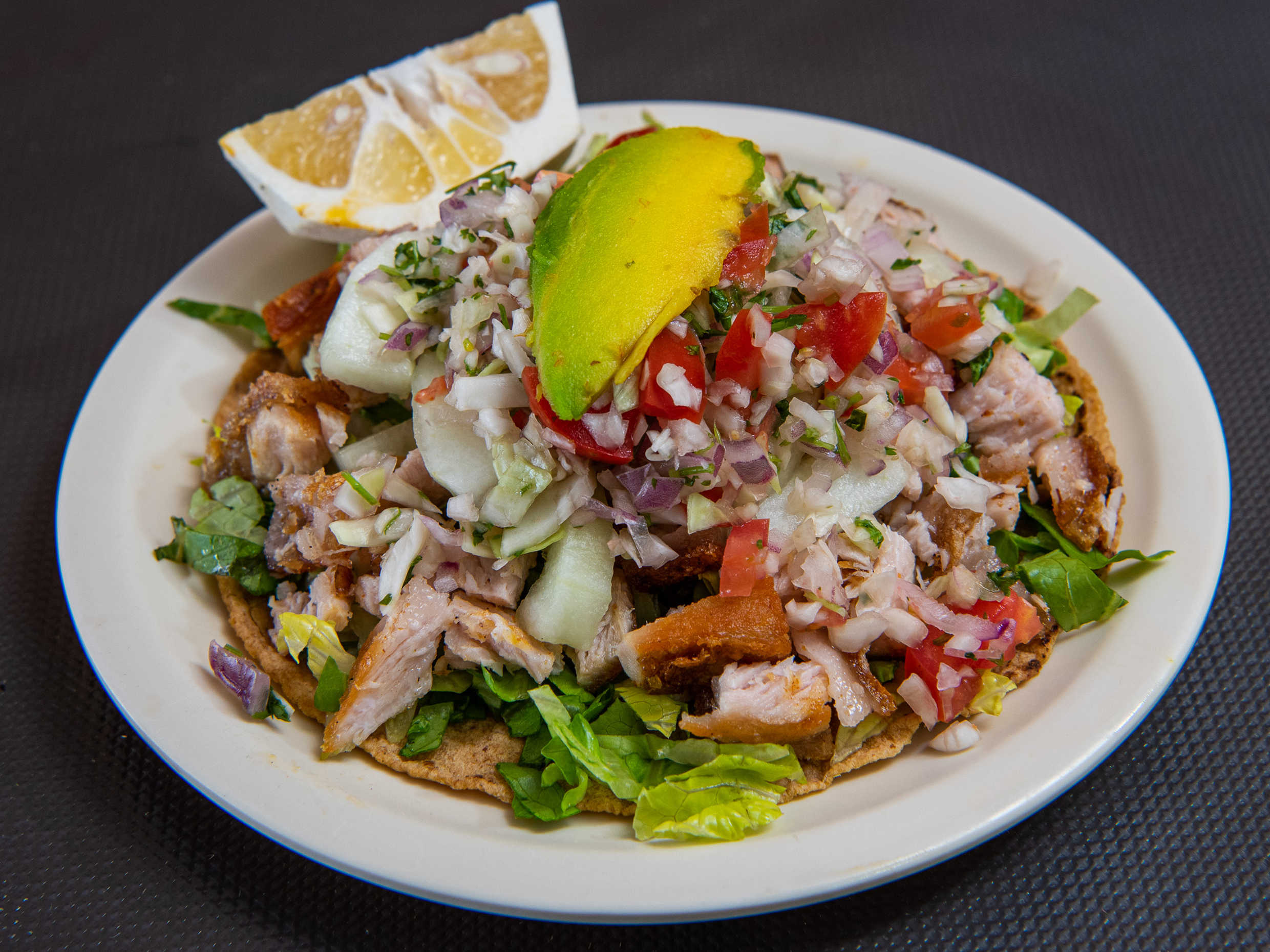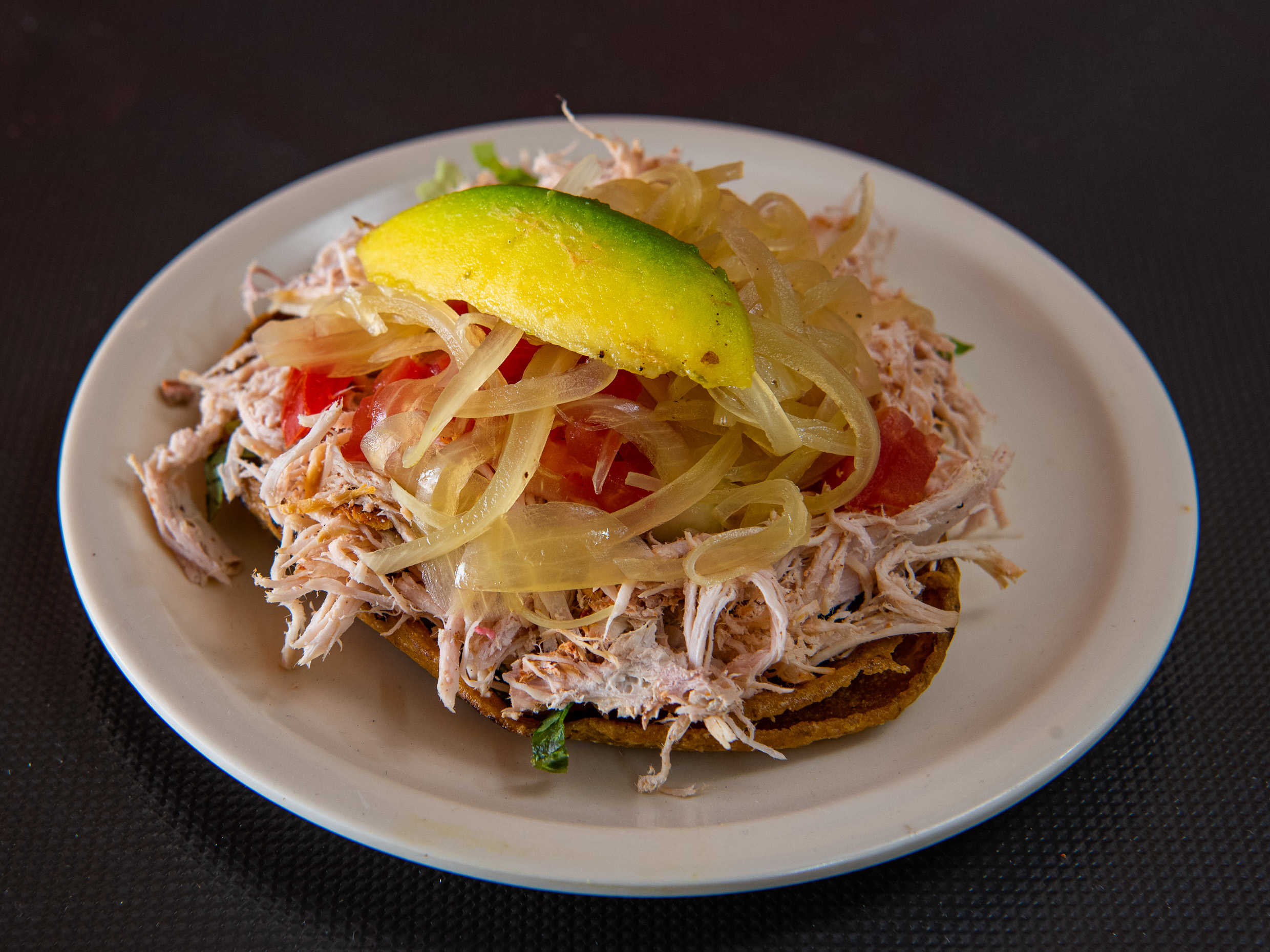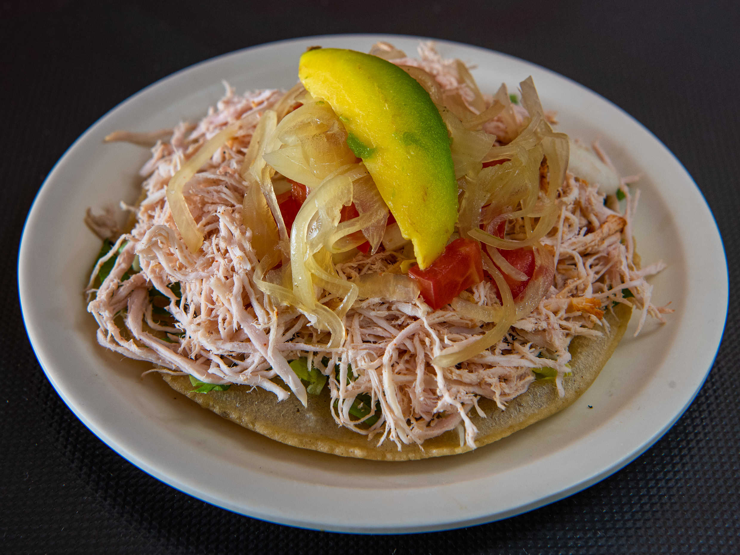 Tradicional panucho de pavo con lechuga, cebolla, tomate, pepino y aguacate.