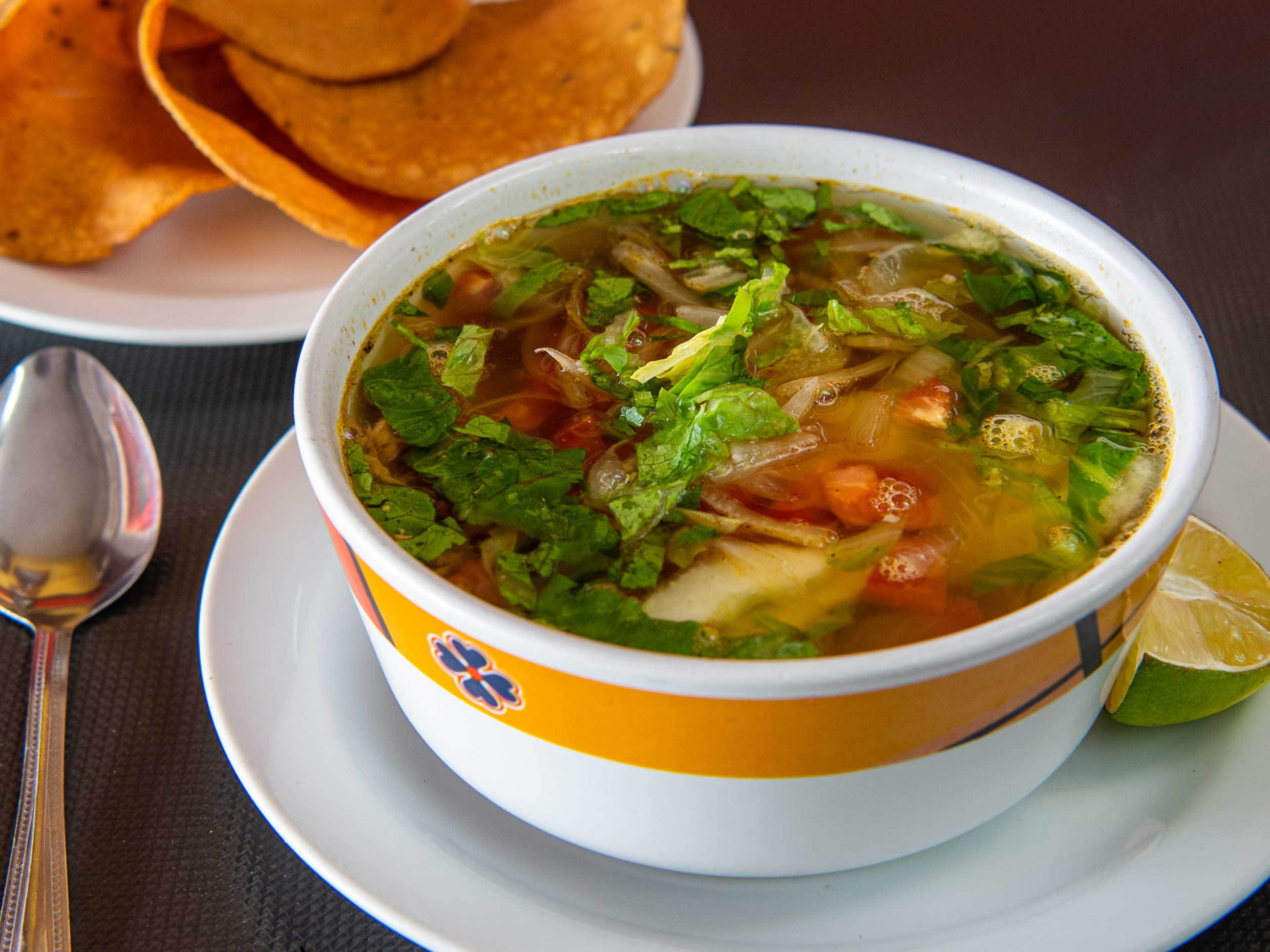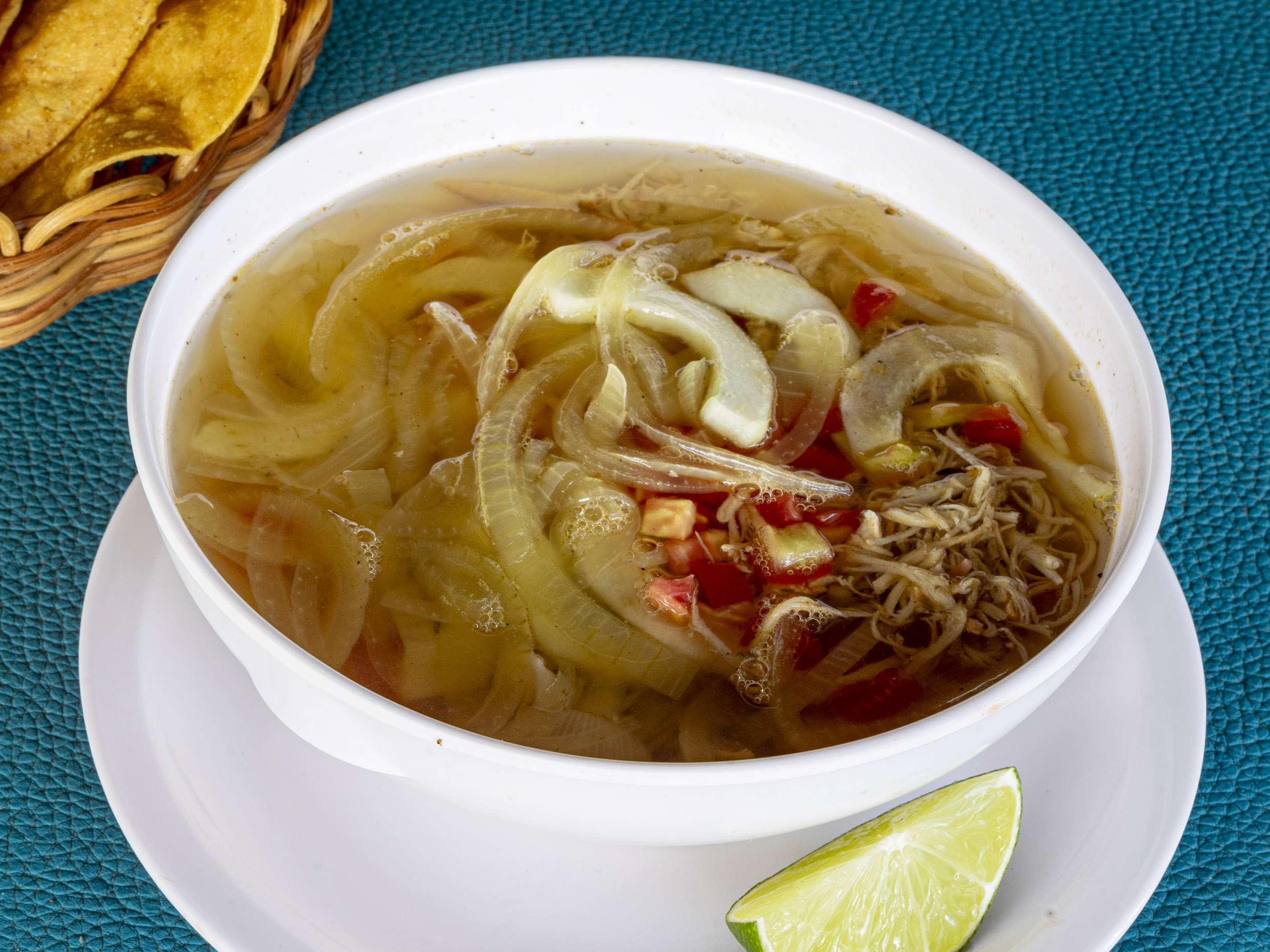 730 ml. Caldo sin carne, con cebolla, tomate, pepino, lechuga, tostadas, limón.