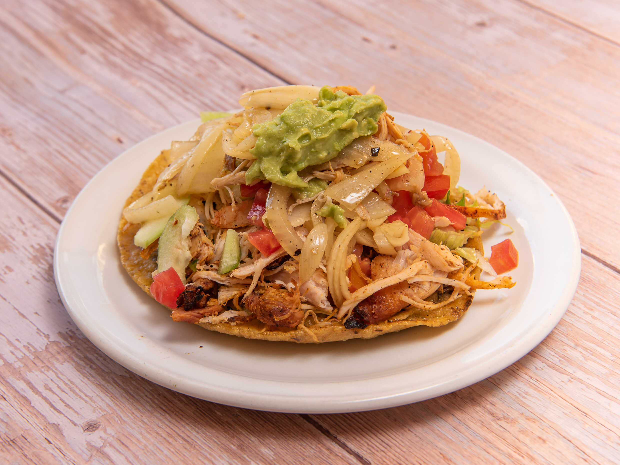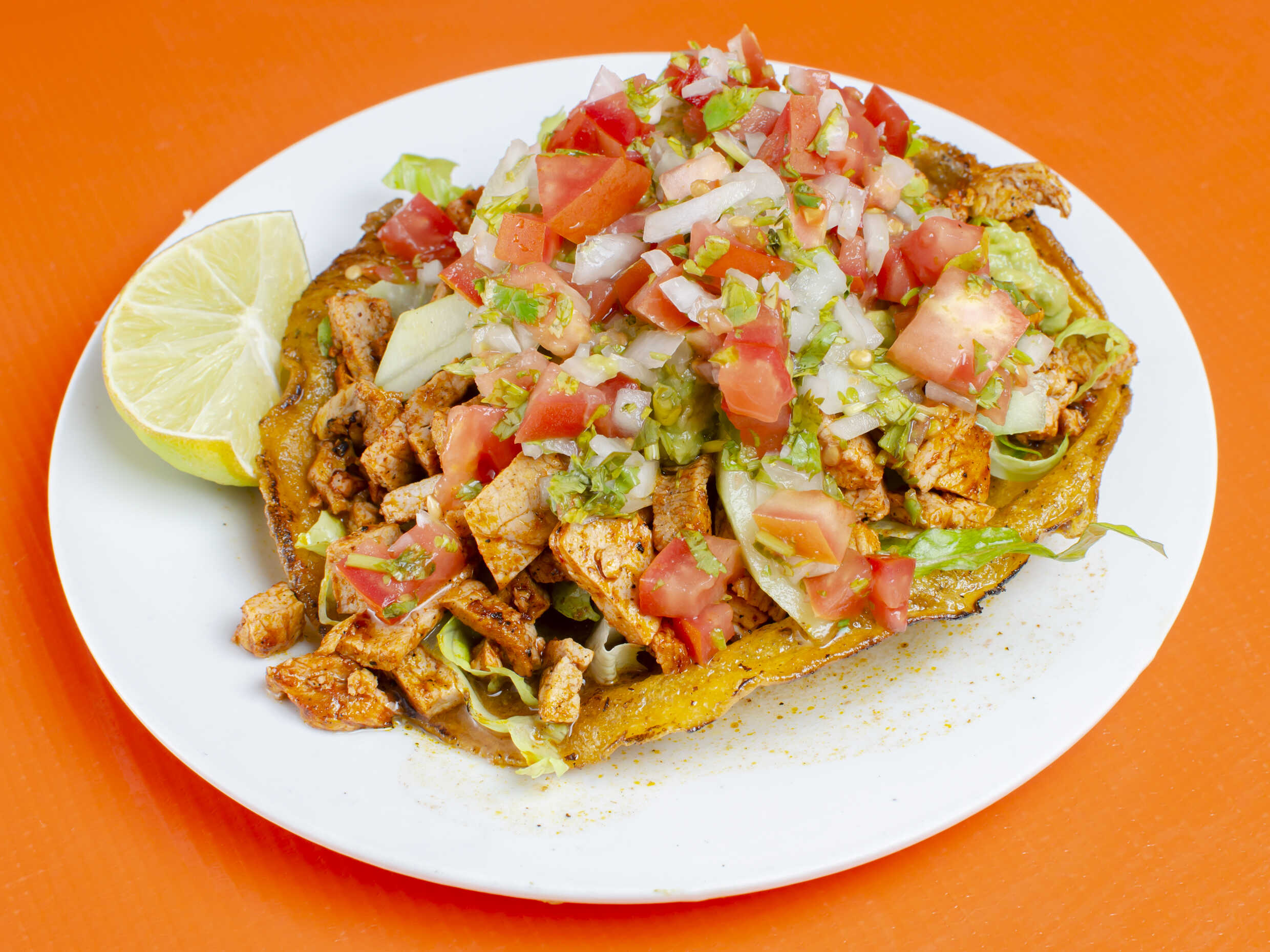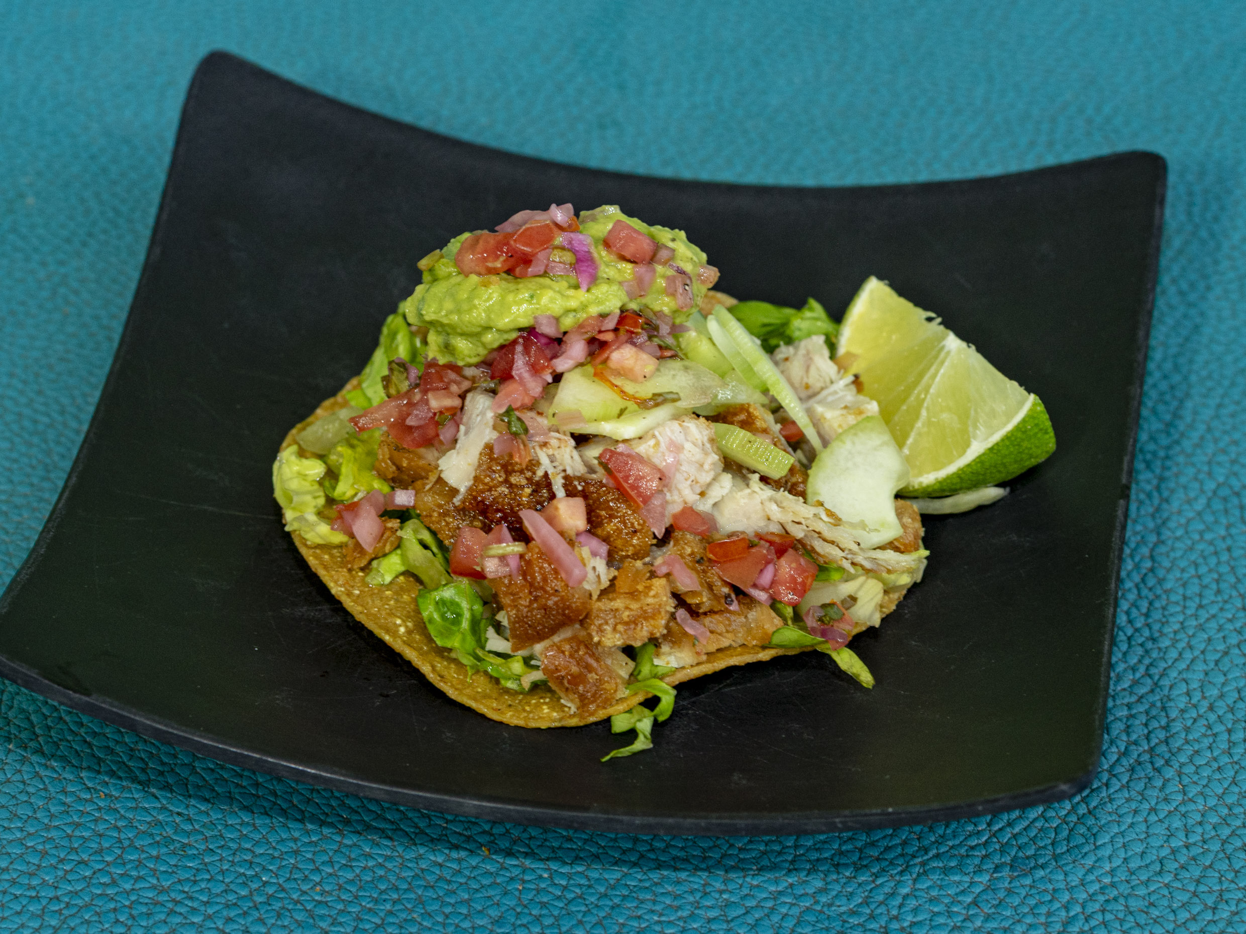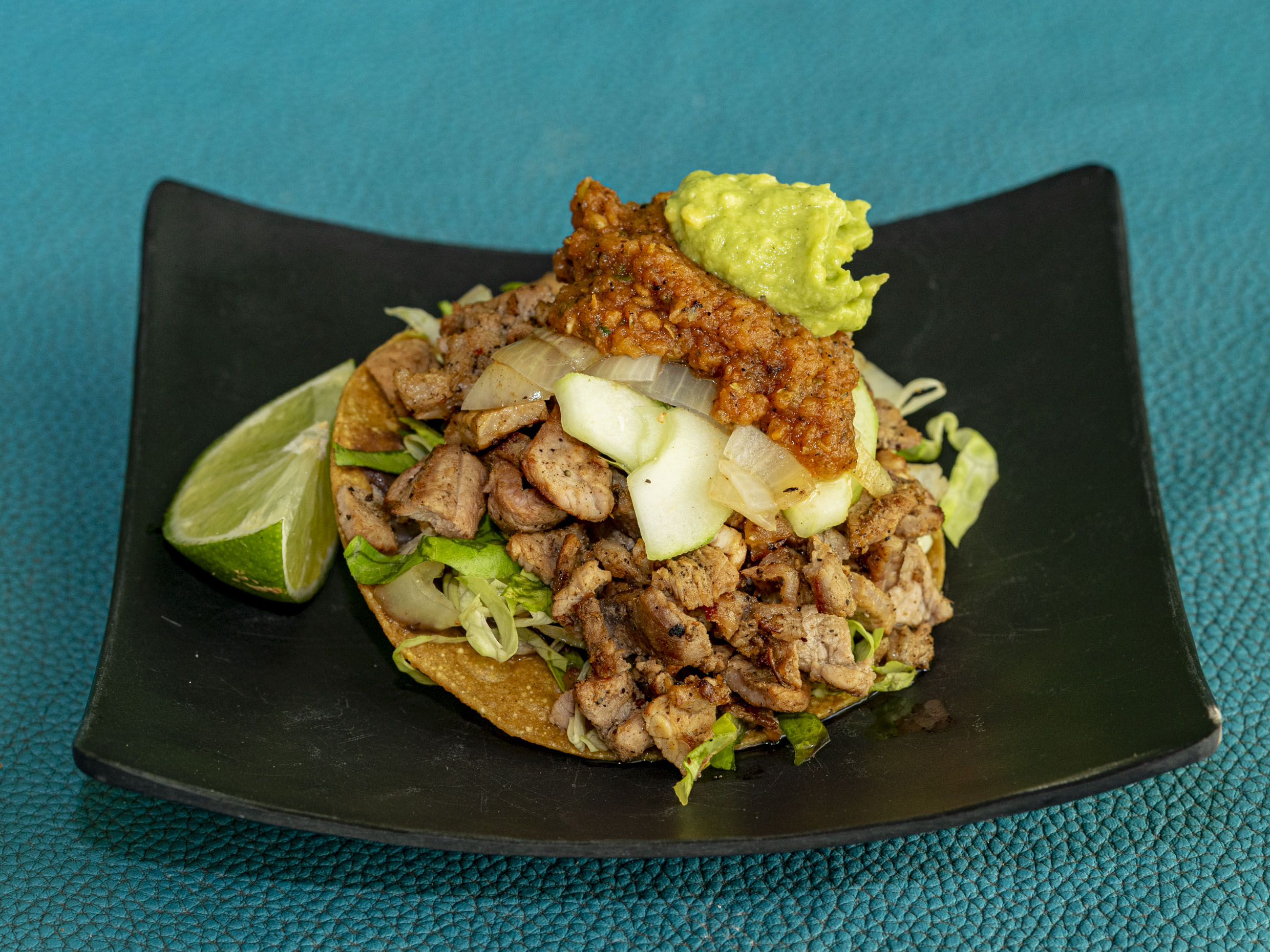 Tortilla frita acompañada de carne de cerdo marinada acompañada de lechuga, pepino, guacamole cebolla asada y tomate asado.