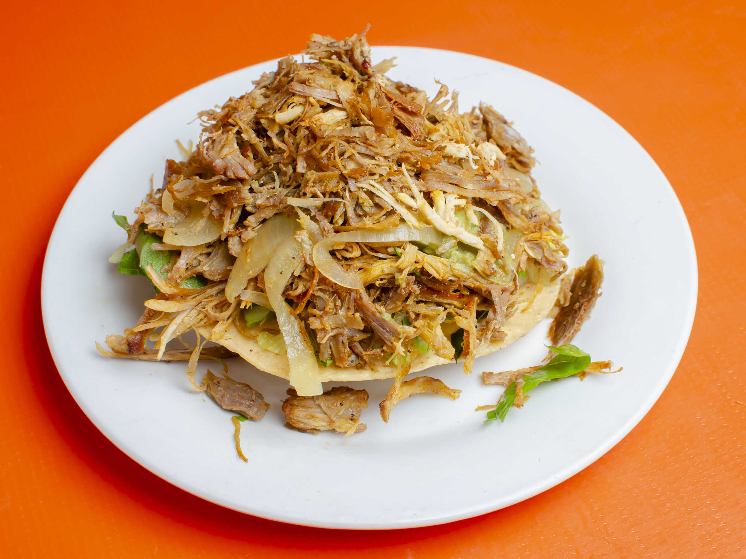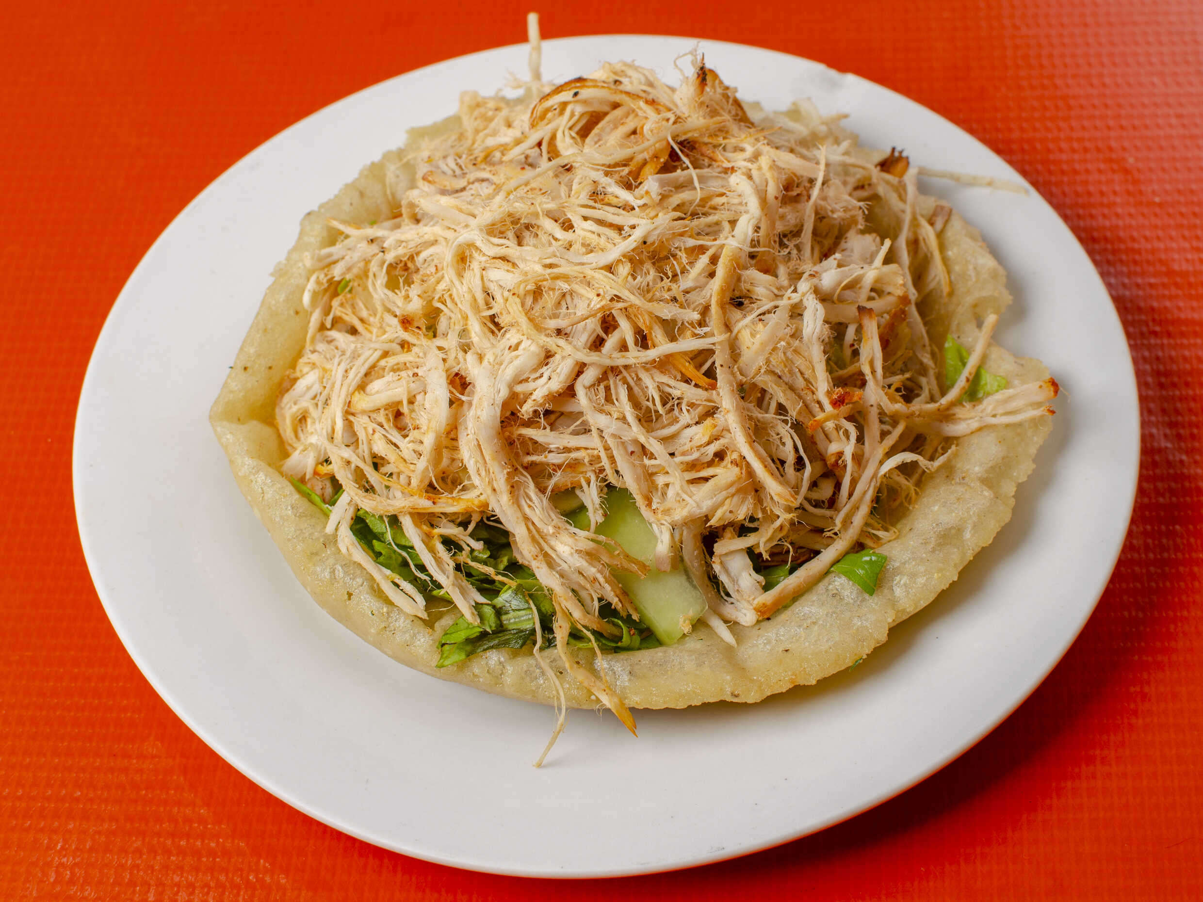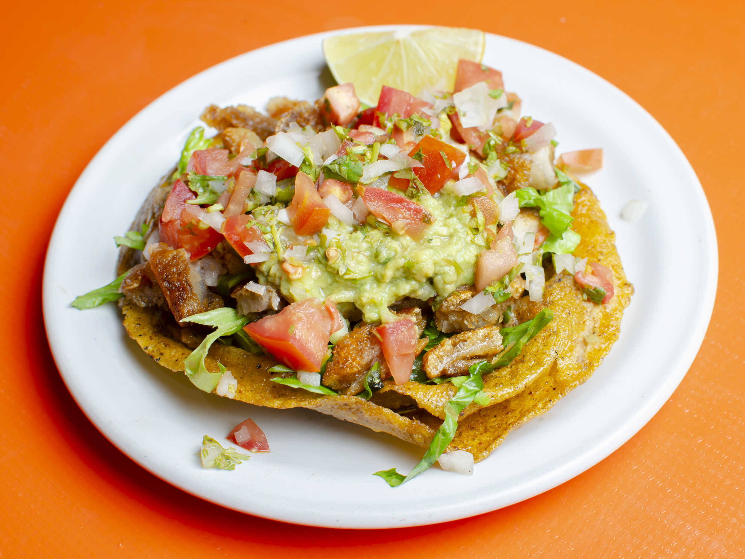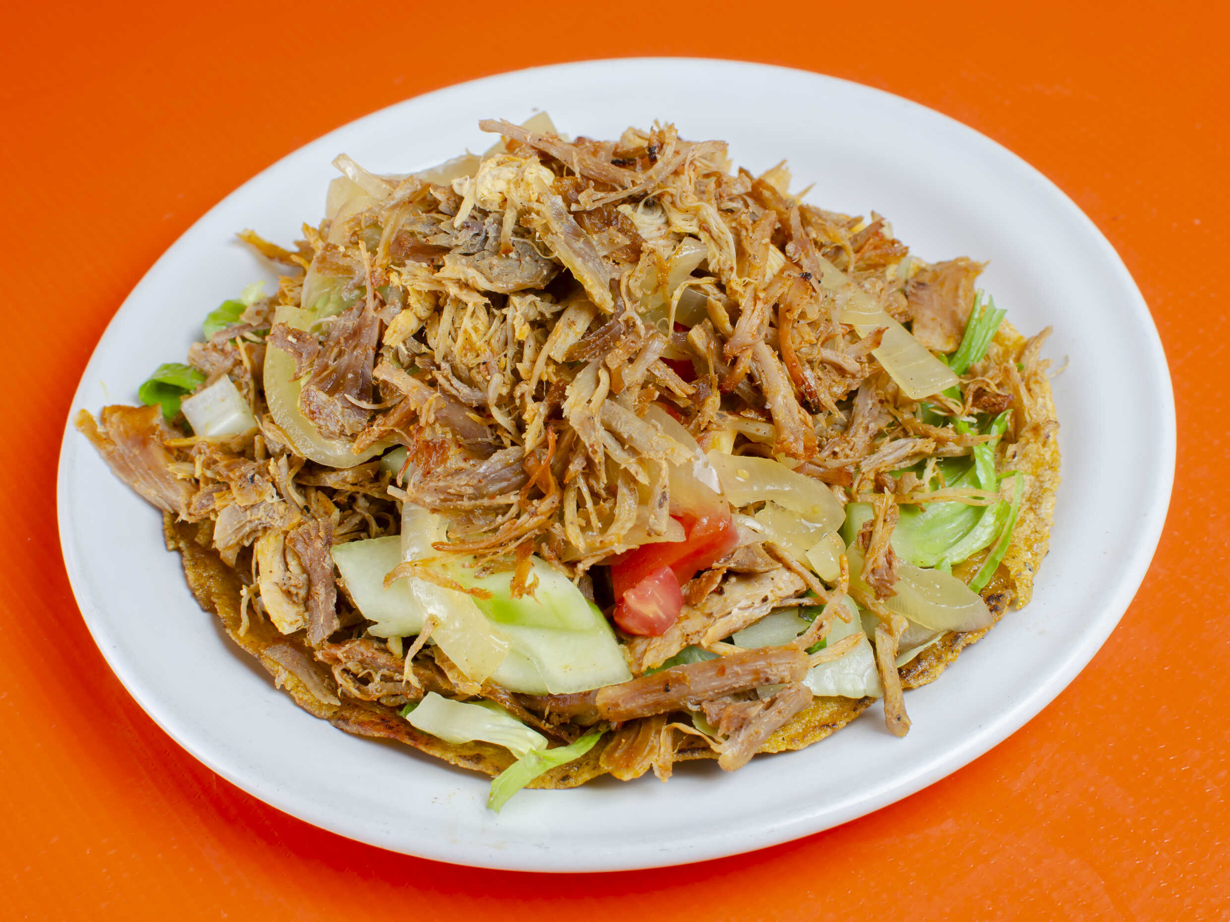 Tortilla frita acompañada de carne de cerdo marinada acompañada de lechuga, pepino, guacamole cebolla asada y tomate asado.