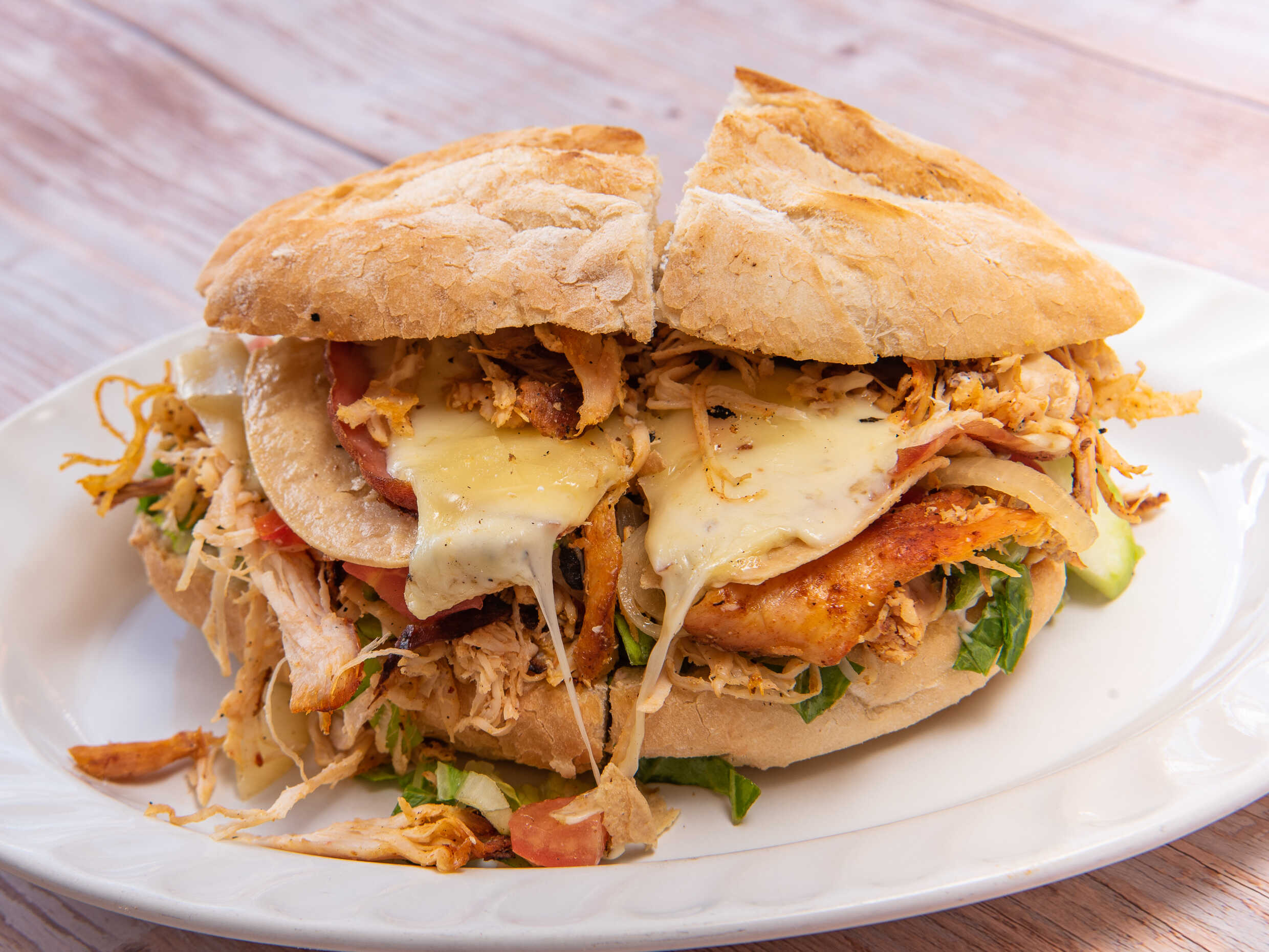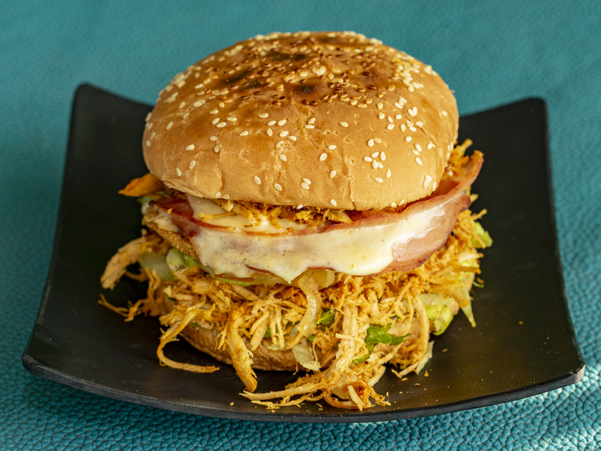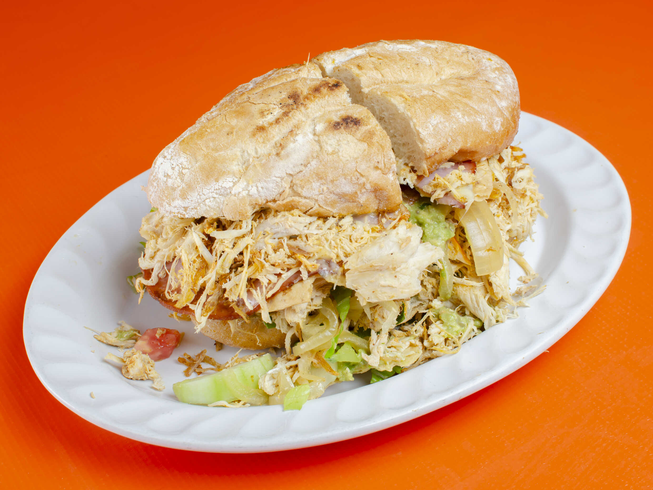 Pan de hamburguesa acompañada de jamón, queso y pavo. Con base de lechuga, pepino, tomate, cebolla de escabeche y guacamole.