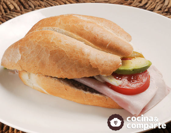 Pan de telera acompañada con 6 rebanadas de jamón y 2 de queso acompañado de vegetales, pepino, tomate, cebolla y guacamole.