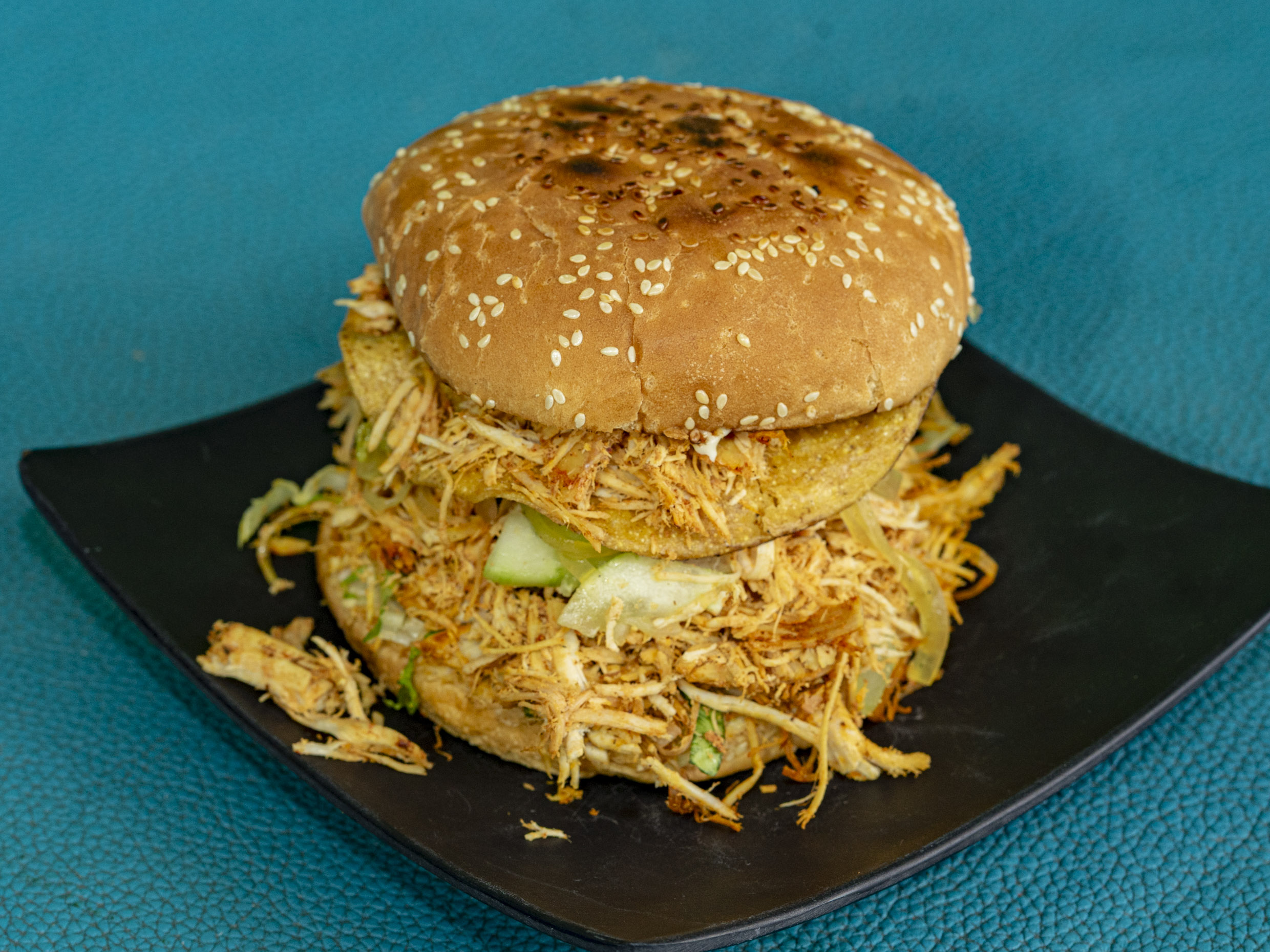 Pan de hamburguesa 140 gramos de carne de pavo asado, guarnición lechuga, tomate, cebolla escabeche, pepino y guacamole.