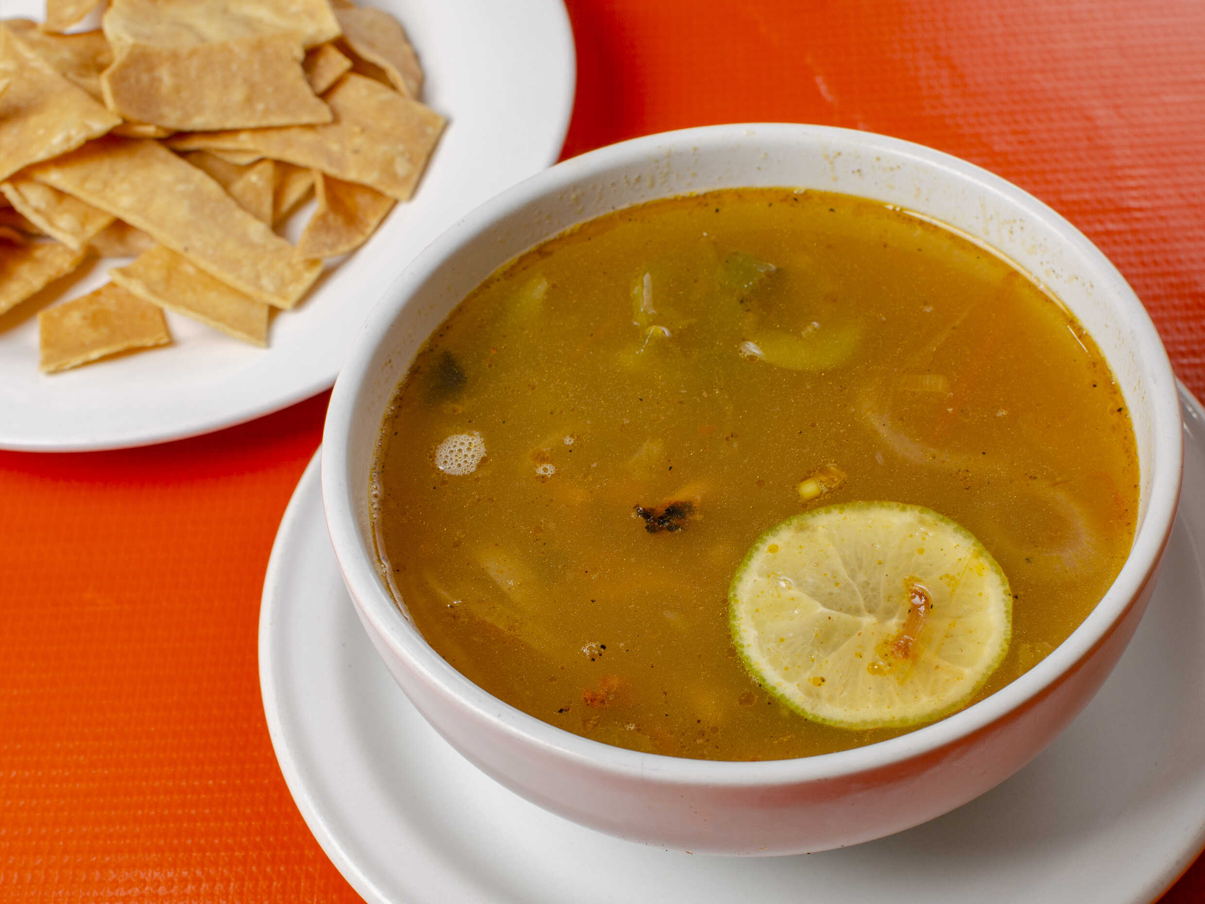 Consomé acompañado con tostadas, limones, pepino, tomate y cebolla de escabeche sin carne.