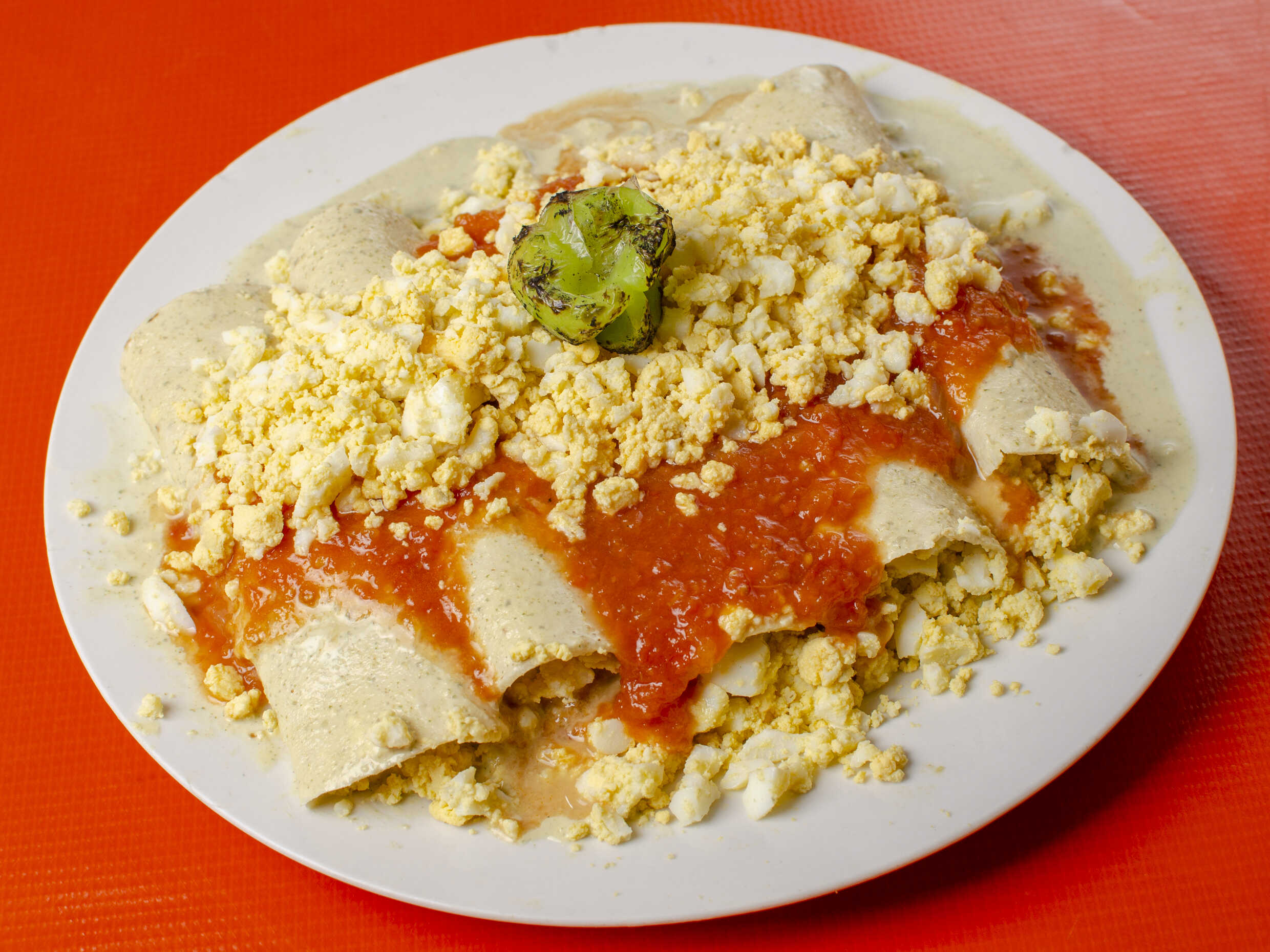 5 Tortillas rellenas de huevo duro bañada de salsa de pepita y tomate frito.
