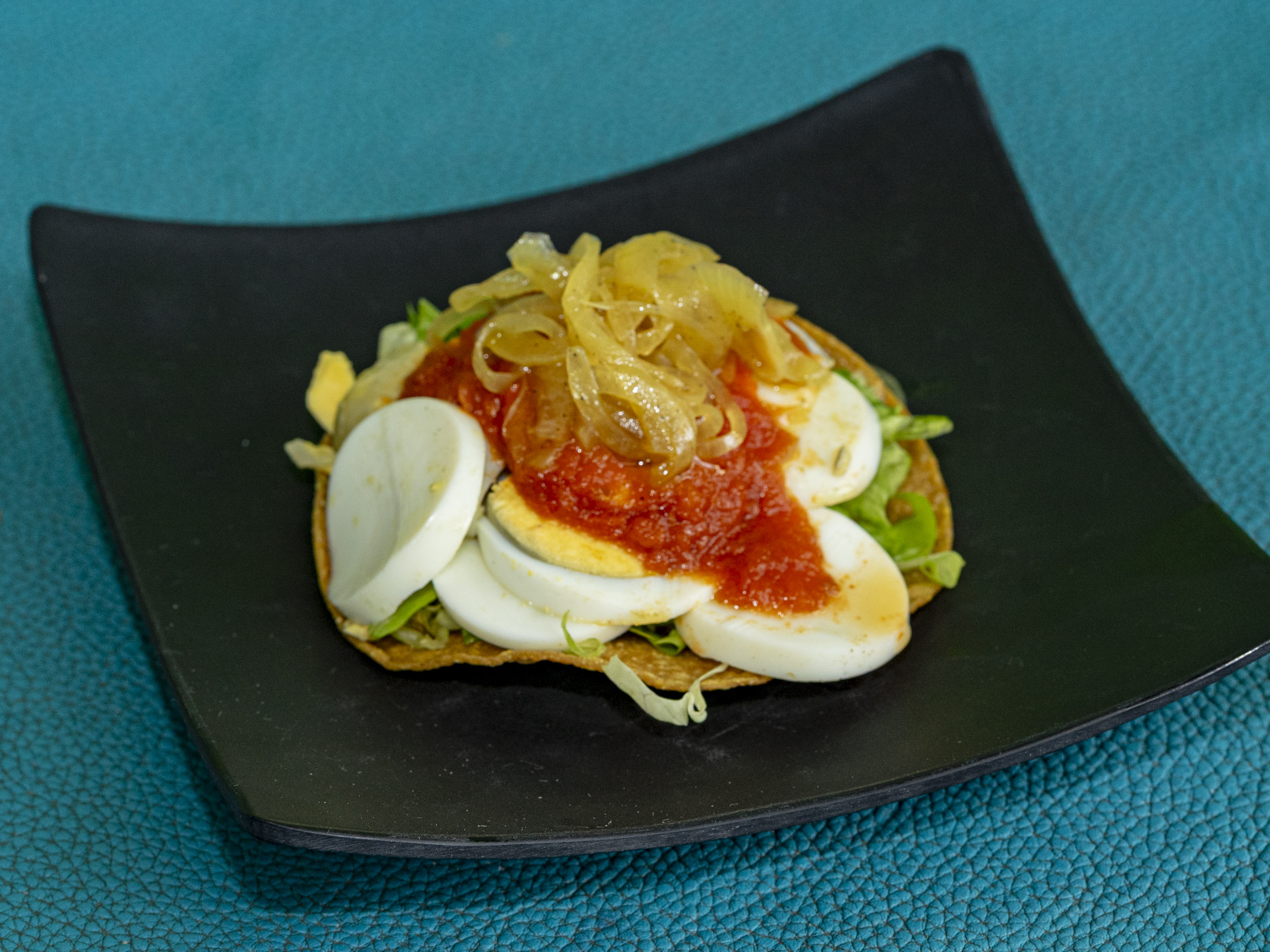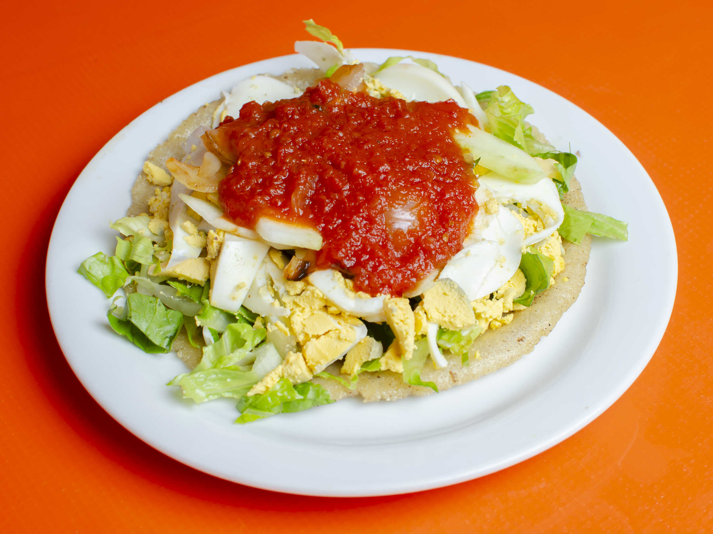 Tortilla frita rellena de frijol acompañada de huevo duro, lechuga, pepino, cebolla asada, tomate frito.