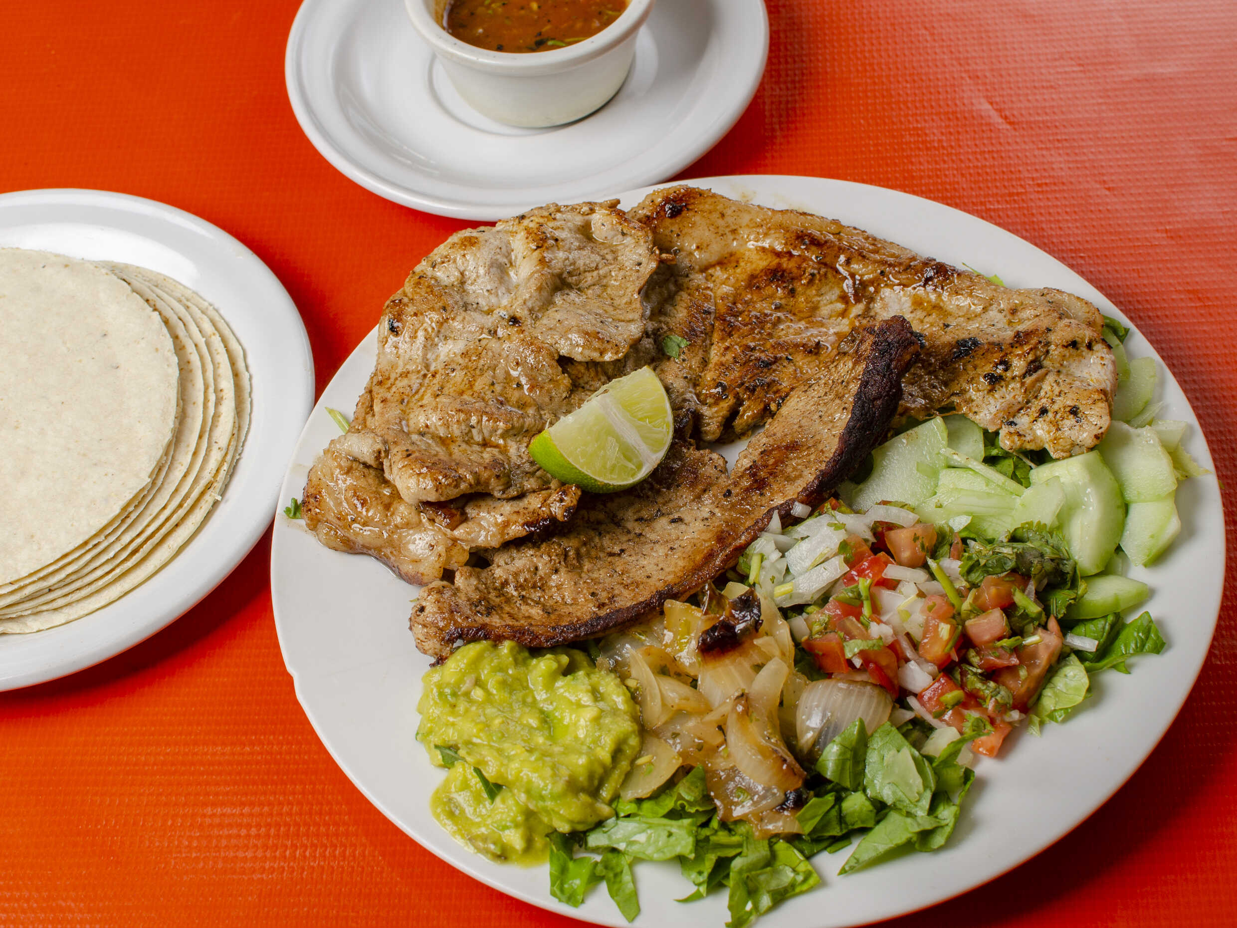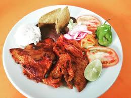 Platillo acompañado 160 gramos de carne de cerdo marinada, acompañado frijol, cebolla asada, tomate asado, lechuga, guacamole, pepino, y tortillas.