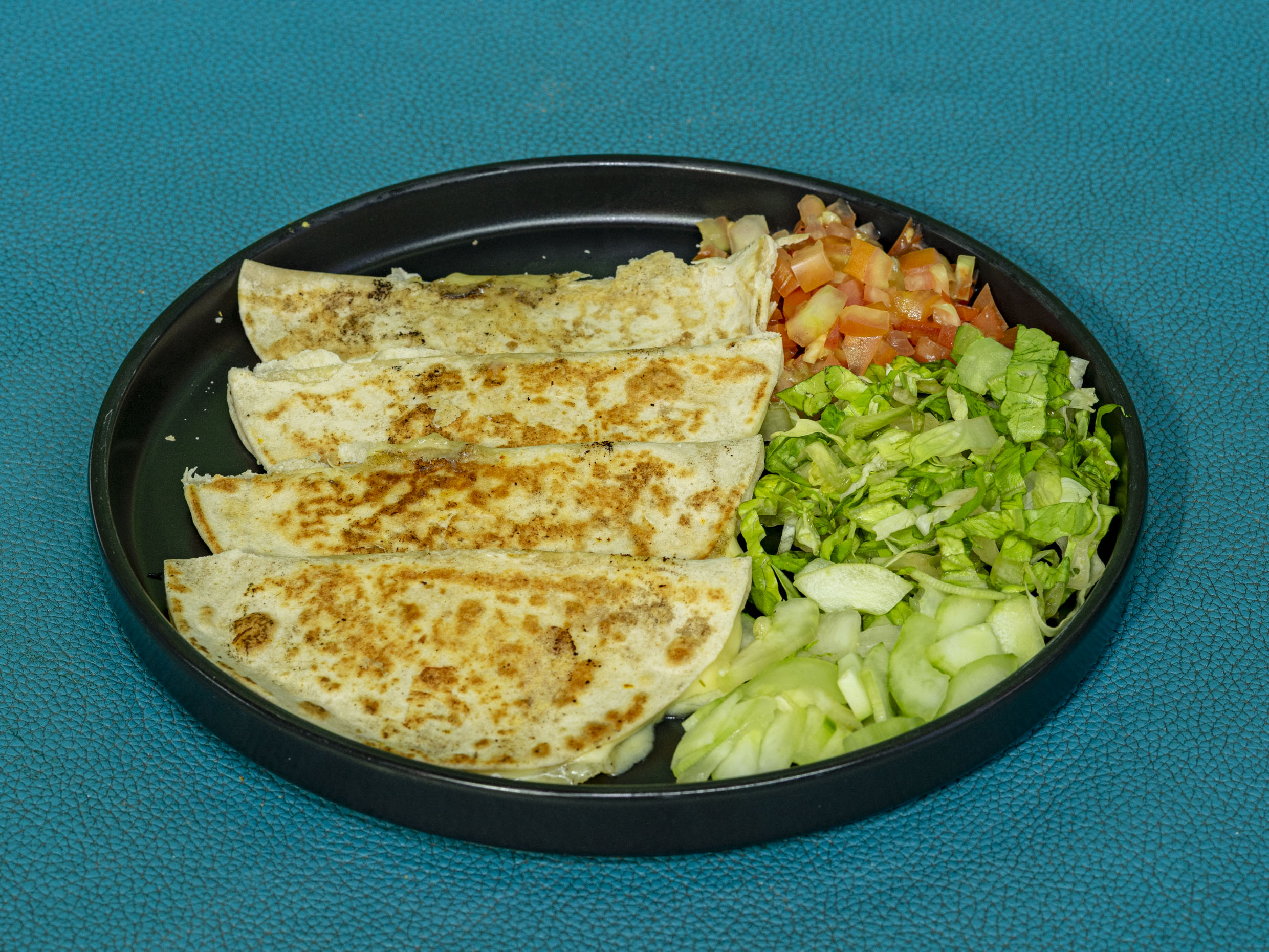 4 Piezas de tortillas con queso, acompañada de ensalada, lechuga, tomate, etc.