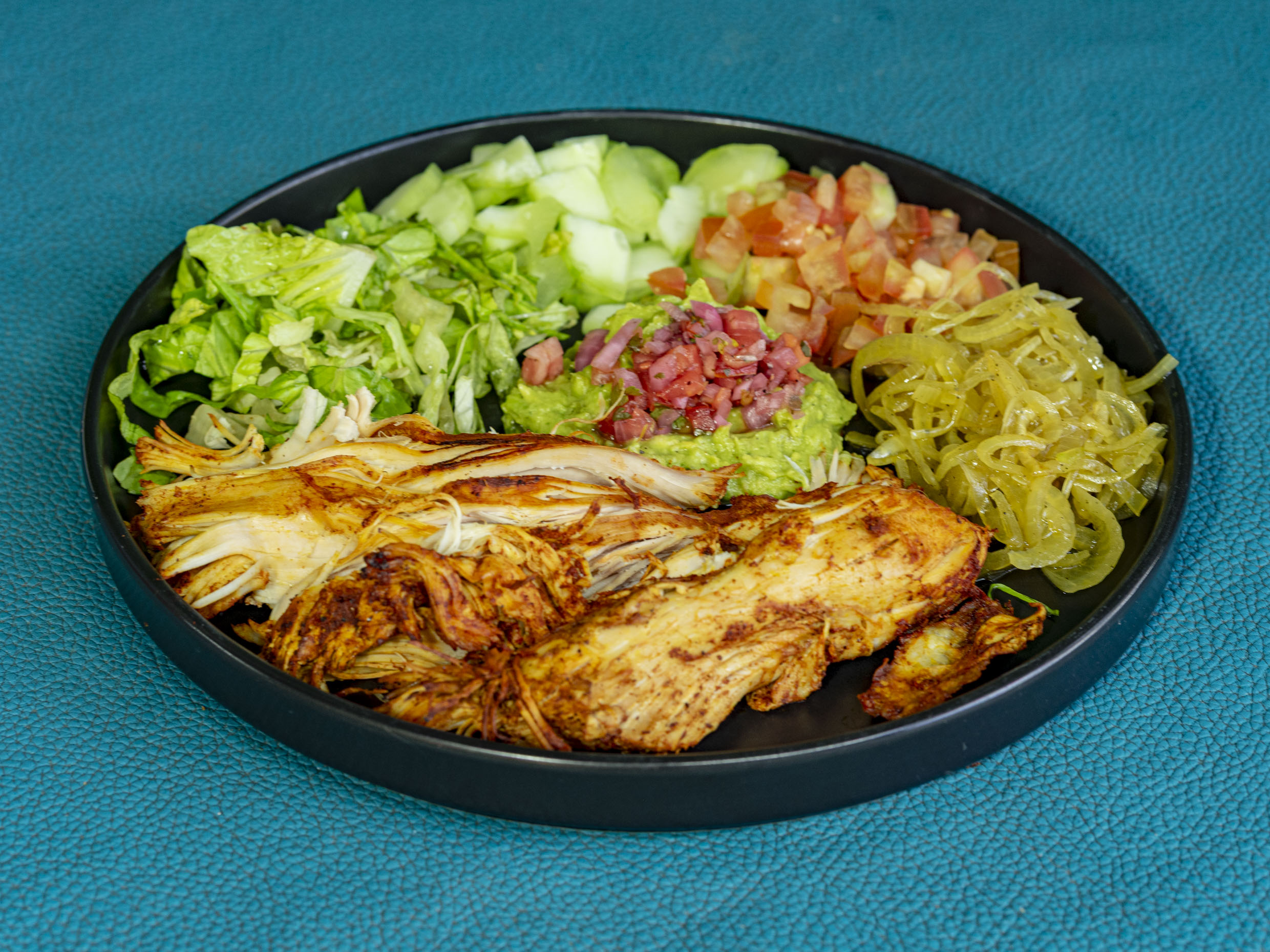 Puerco marinado y asado a la plancha acompañado con base de lechuga, pepino, guacamole, frijol, pico de gallo y tortillas.