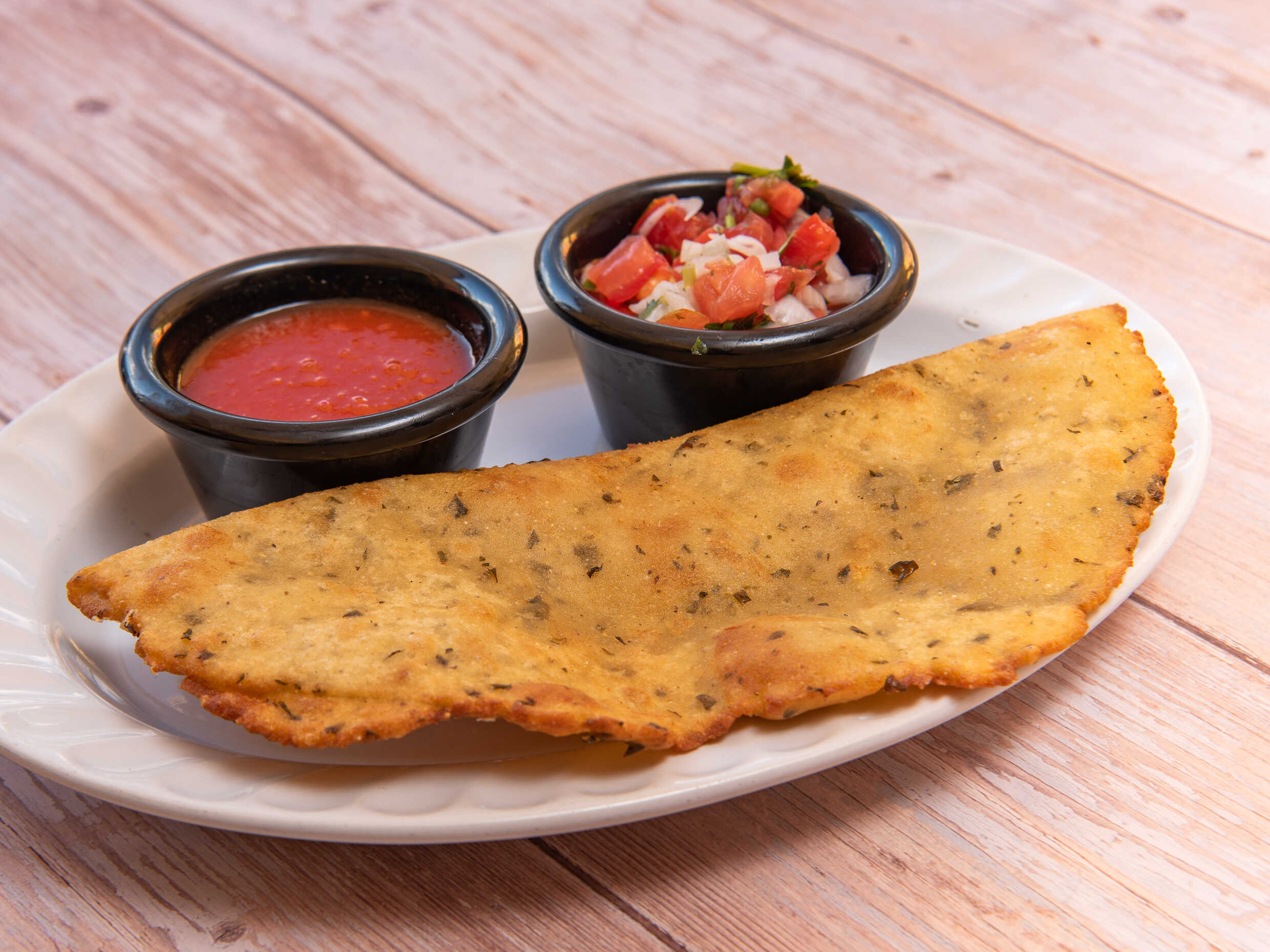 Empanada 3 ingredientes queso manchego, pavo y frijol. Acompañada de pico de gallo y salsa de tomate.