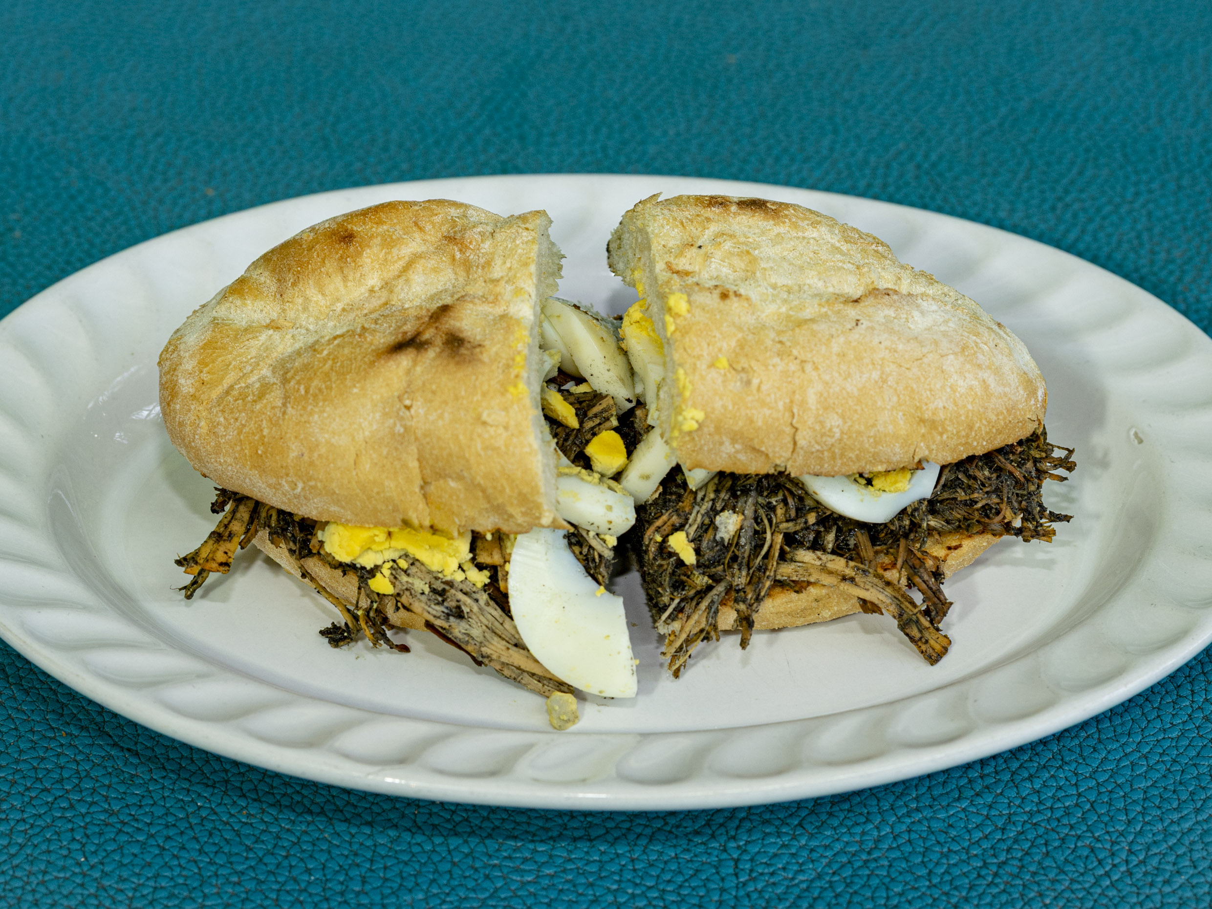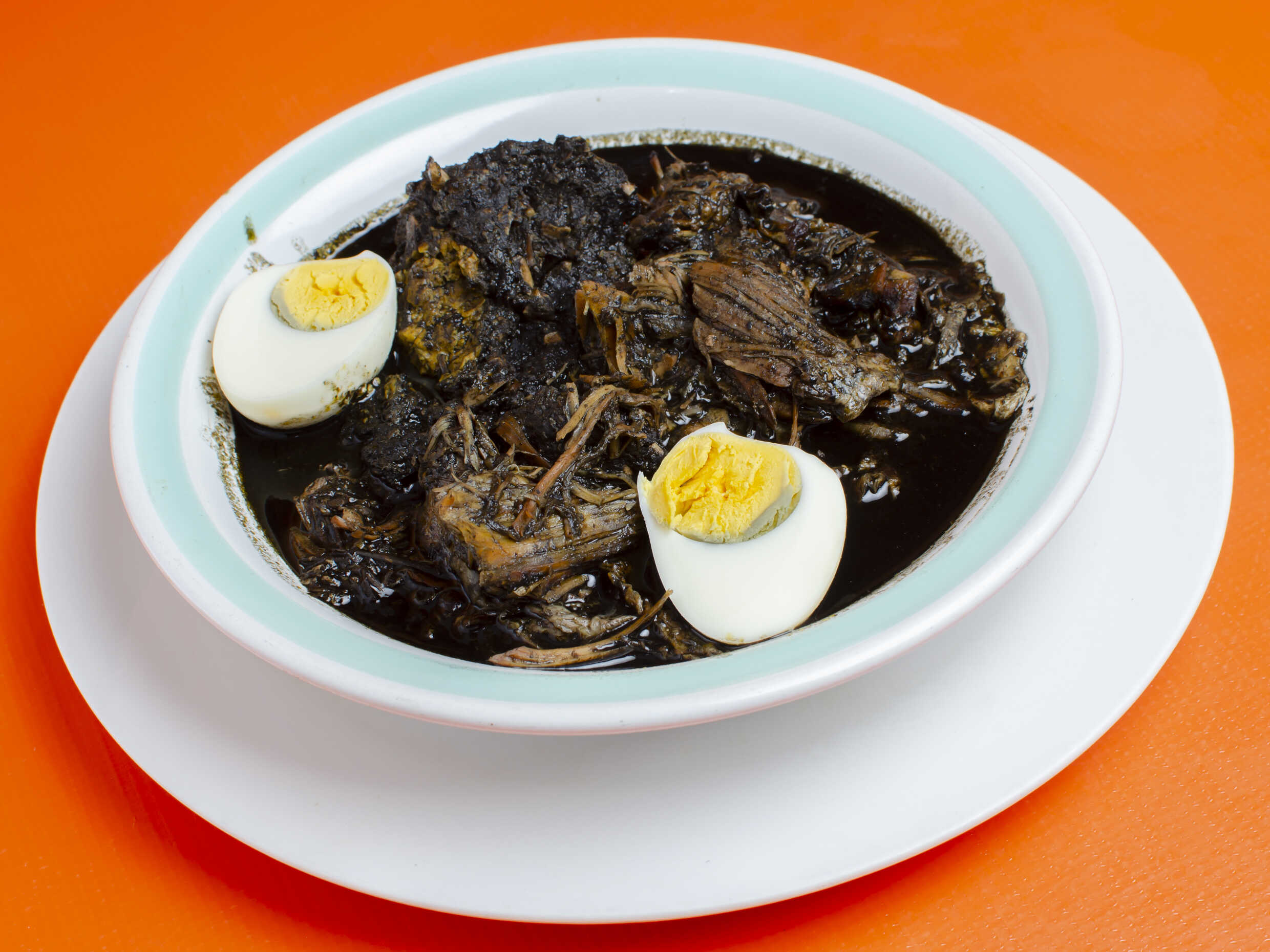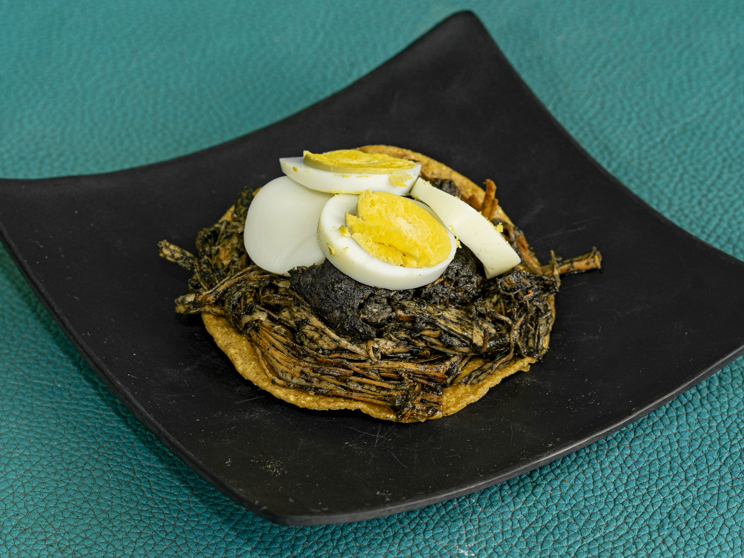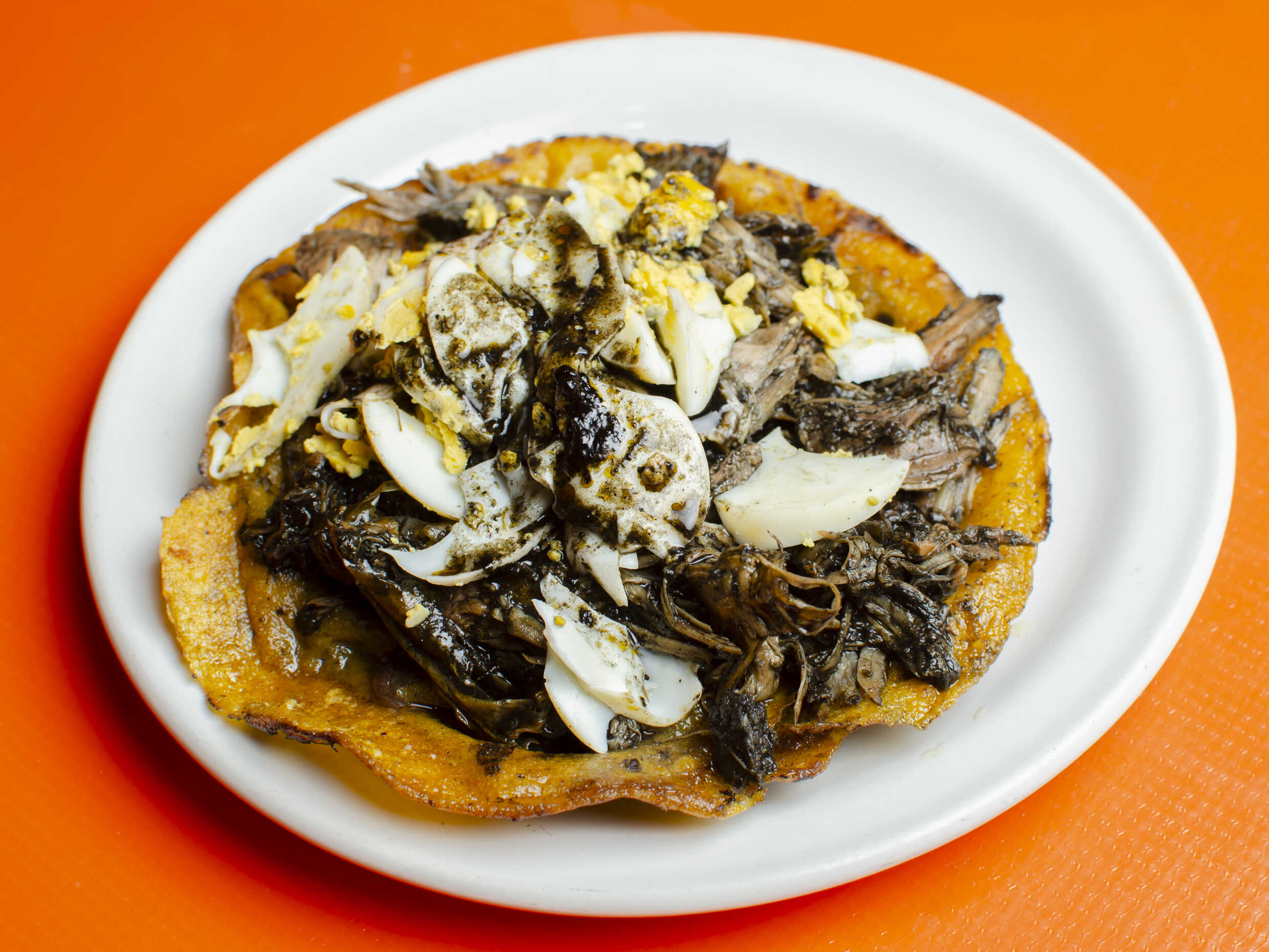 Tortilla frita acompañado de pavo en relleno negro, carne de but y huevo duro.