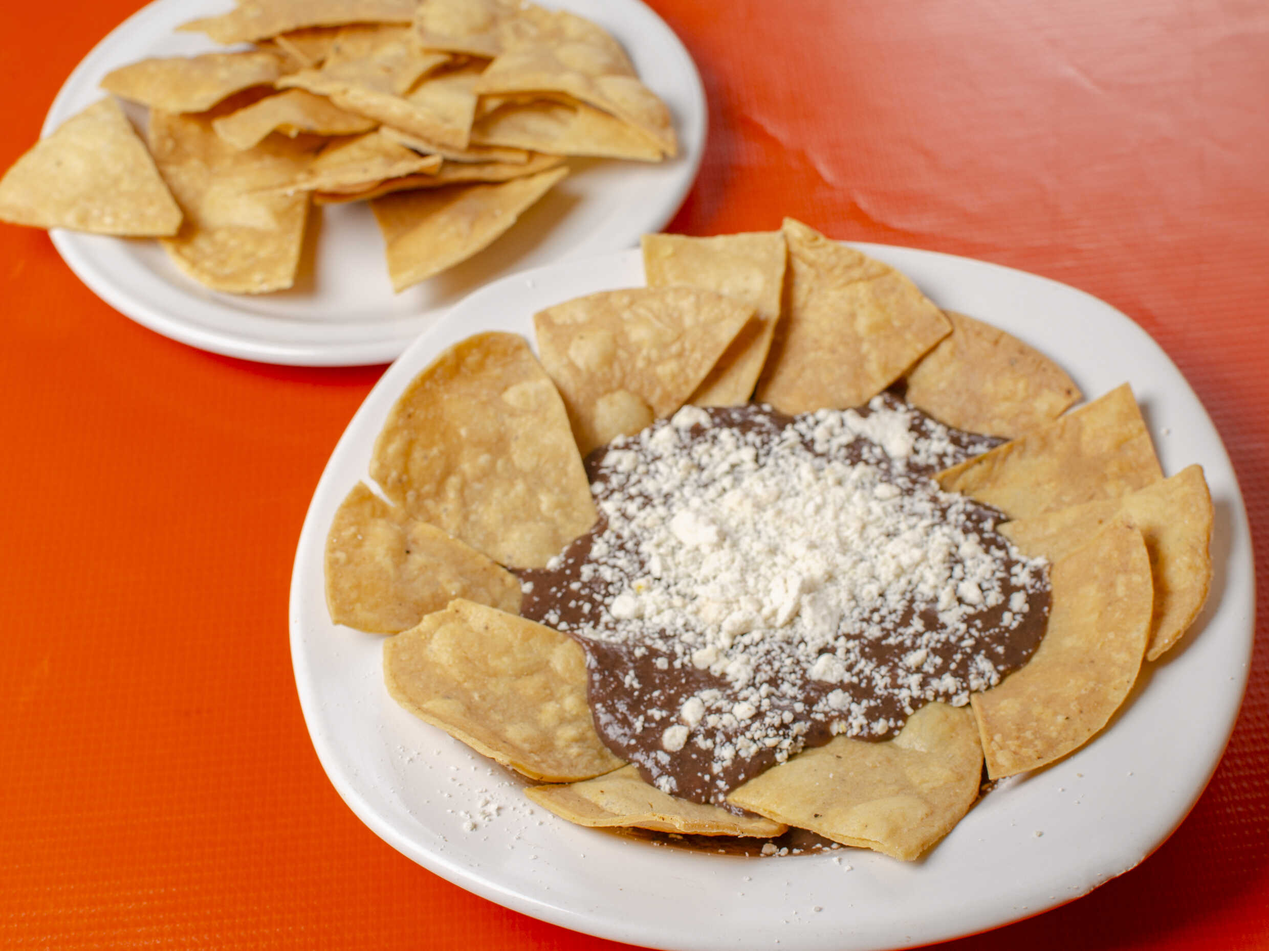 Orden de frijol con queso blanco acompañado de tostadas.
