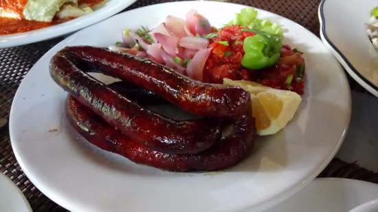 Tortilla frita acompañada de longaniza a la plancha acompañada de lechuga, pepino, guacamole y pico de gallo.
