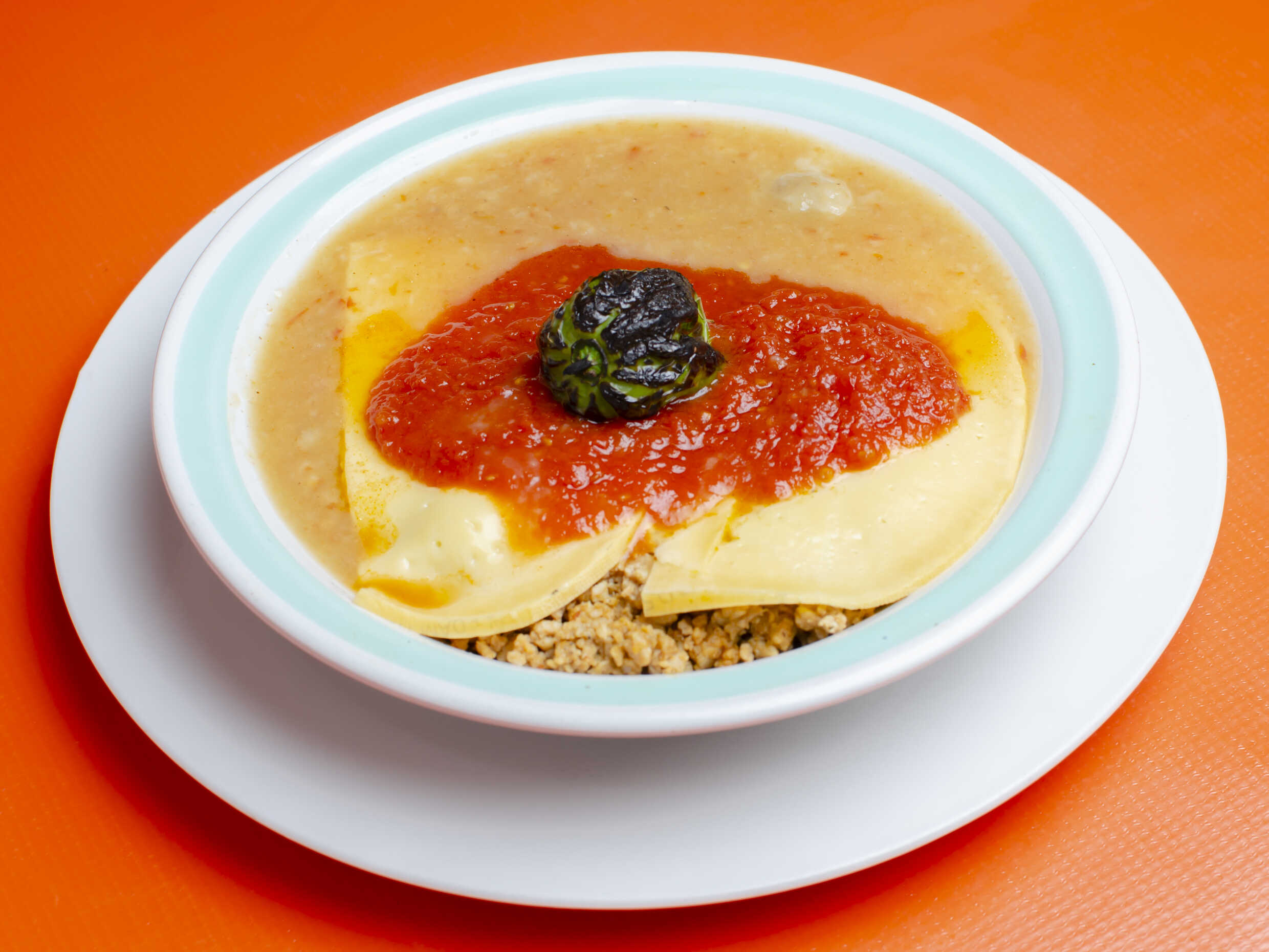 Consomé acompañado con 120 gramos de carne de pavo guisado con caldo de pavo, lima, morrón verde, tomate rojo y cebolla.