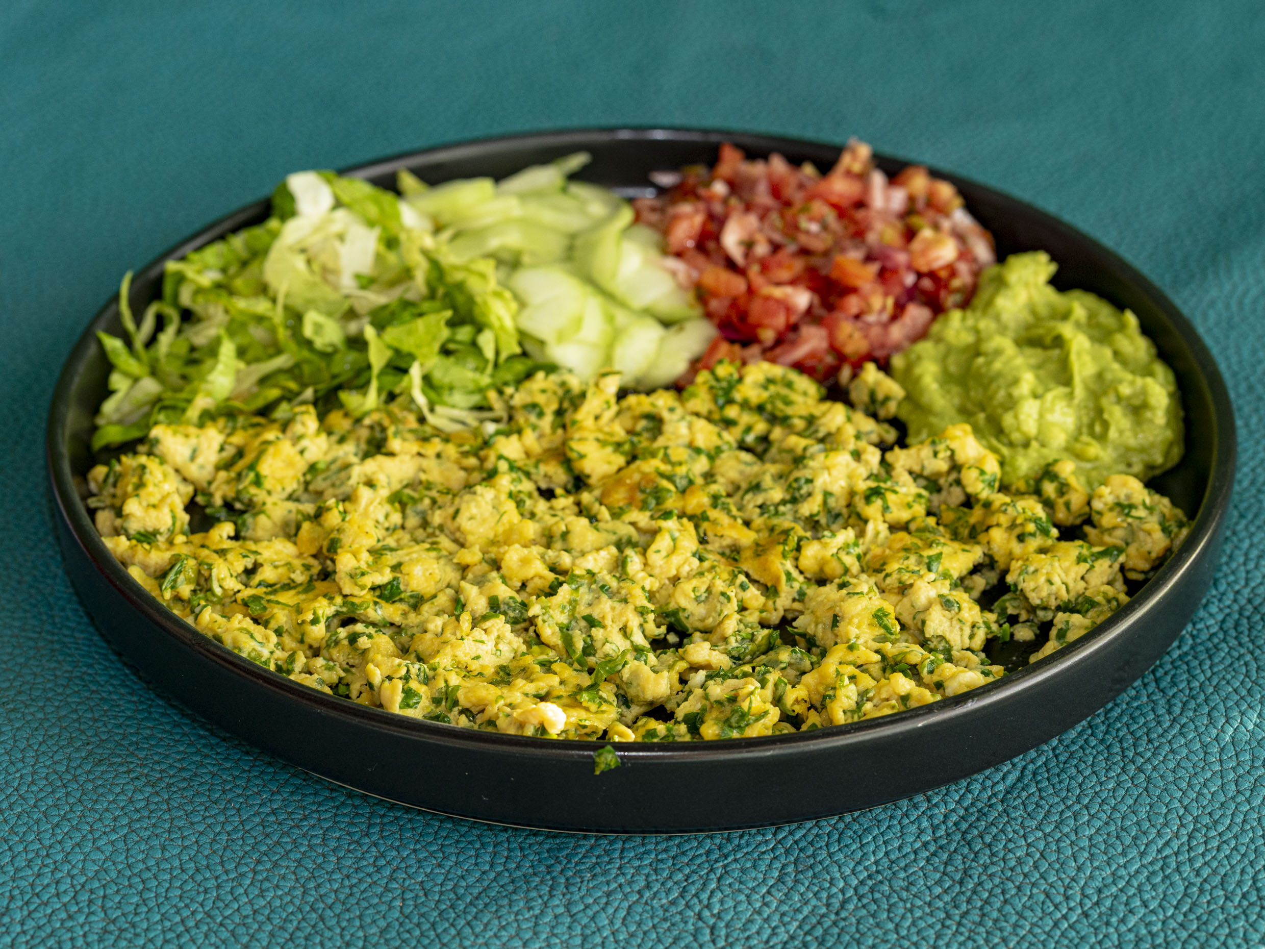Tortilla frita acompañado huevo duro, lechuga, pepino, cebolla asada y tomate frito.