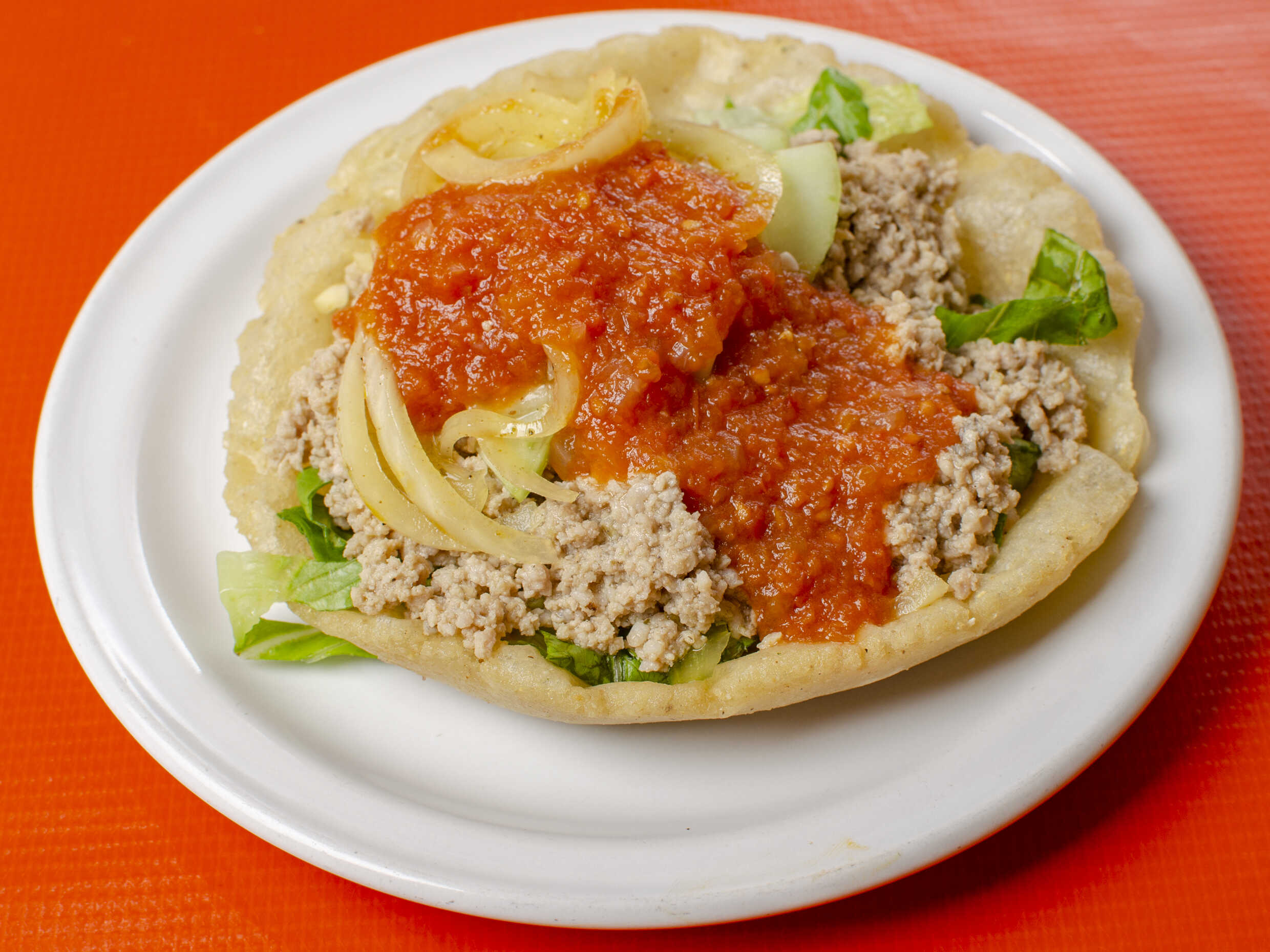 Tortilla frita rellena de frijol acompañada de carne de cerdo marinada, lechuga, pepino, cebolla asada, tomate asado y frijoles.