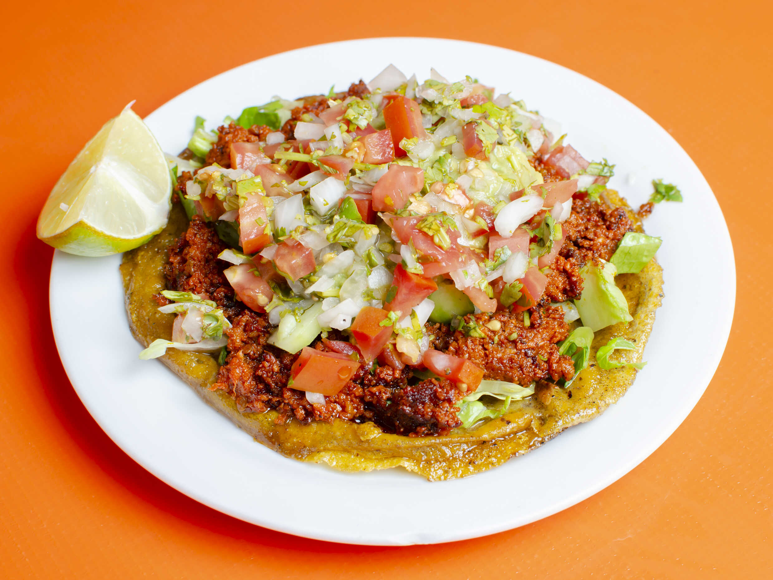 Tortilla frita rellena de frijol acompañada de puerco asado rojo, lechuga, pepino, pico de gallo y guacamole.