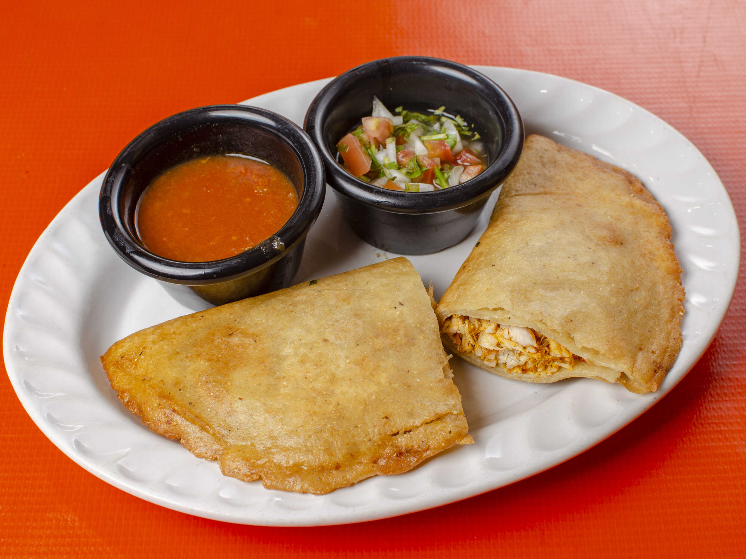 Empanada rellena de frijol acompañada de salsa de tomate y pico de gallo.