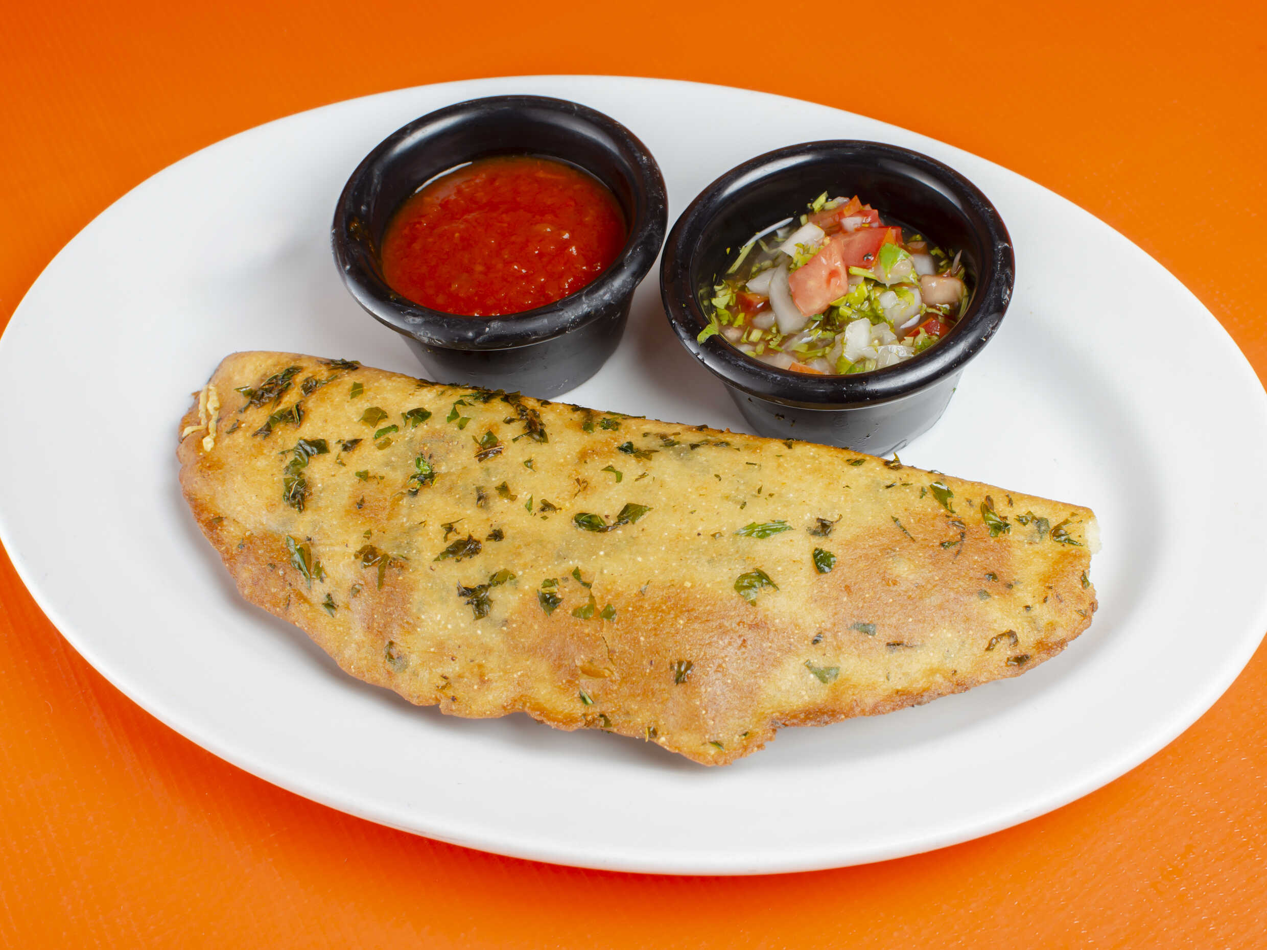 Empanada rellena de queso acompañada de salsa de tomate y pico de gallo.