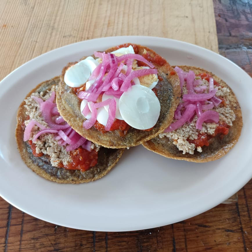 Tortilla rellena de frijol frita, con lechuga, tomate y guiso a elegir.