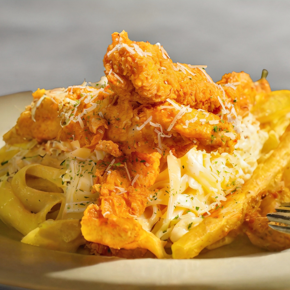 Cremosa salsa alfredo, tiras de pechuga empanizada, bañadas en salsa a tu elección, parmesano, pan con ajo y mantequilla.