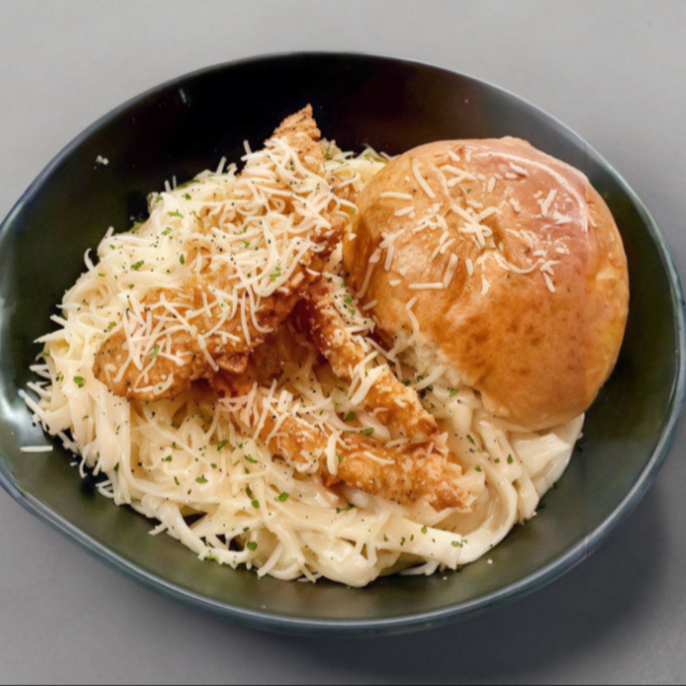 Cremosa salsa alfredo, tiras de pechuga empanizada, bañadas en salsa a tu elección, parmesano, pan con ajo y mantequilla.