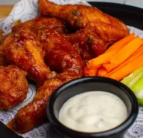 Jugosas alitas bañadas en salsa a elegir, aderezo ranch y vegetales de temporada.