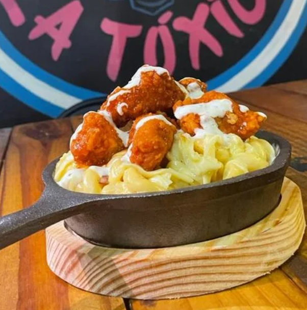 Pasta de coditos mezclado con salsa de queso cheddar y tocino, acompañado de 5 boneless bañados en salsa a elección y aderezo ranch.