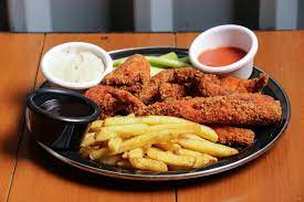 Trocitos de pollo empanizados bañados en salsa a elegir acompañados de papas a la francesa, aderezo ranch y vegetales de temporada.