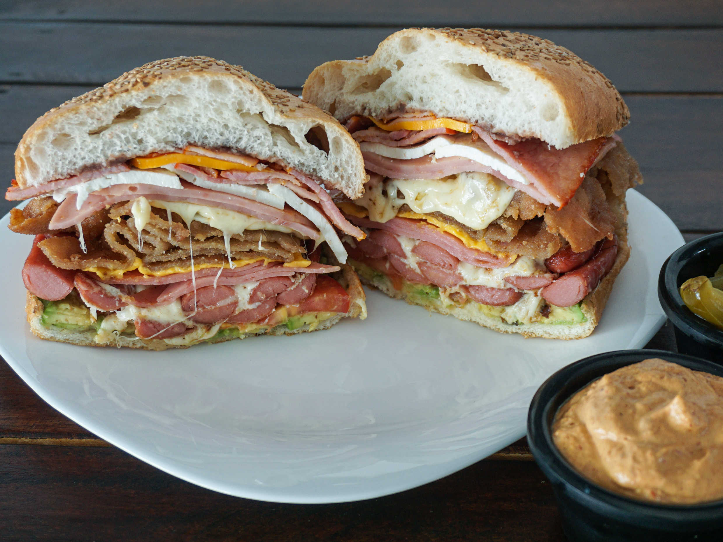 Jamon Serrano, queso chihuahua, queso gouda, aguacate, jitomate y mayonesa.