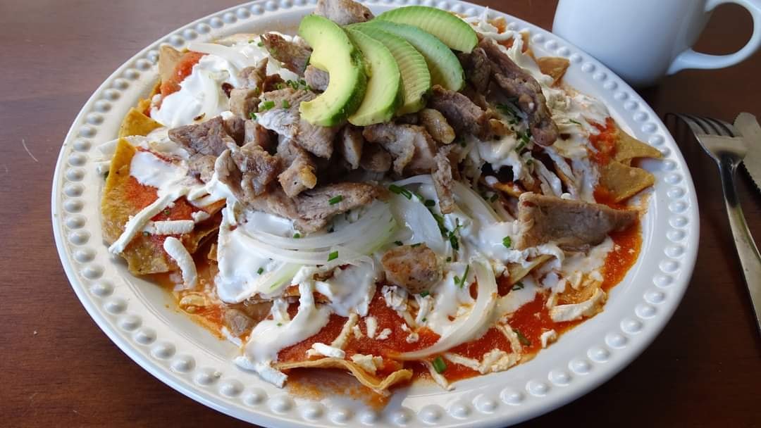 Deliciosos chilaquiles rojos, acompañado de proteína a elegir, queso panela y crema.