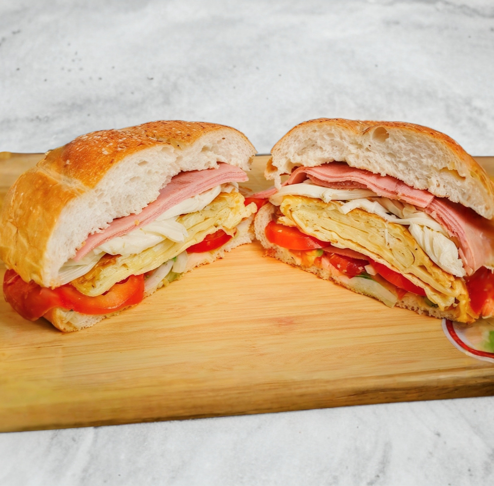 Huevo, jamón de pavo, quesillo, jitomate, aguacate, mayonesa y frijol.