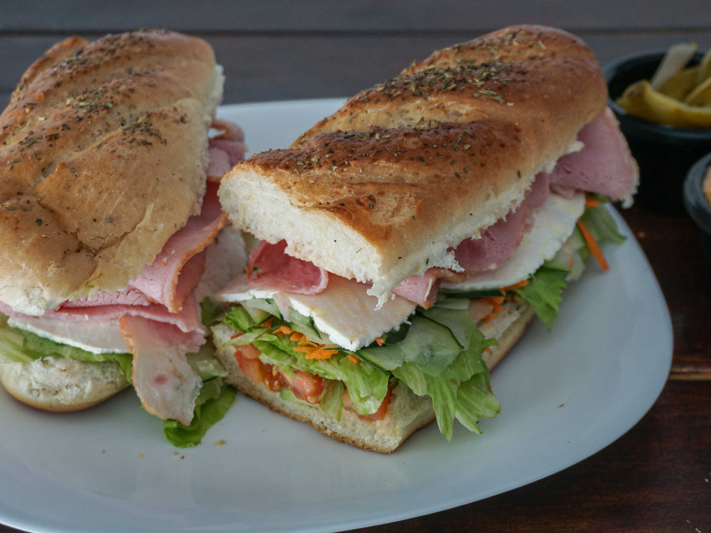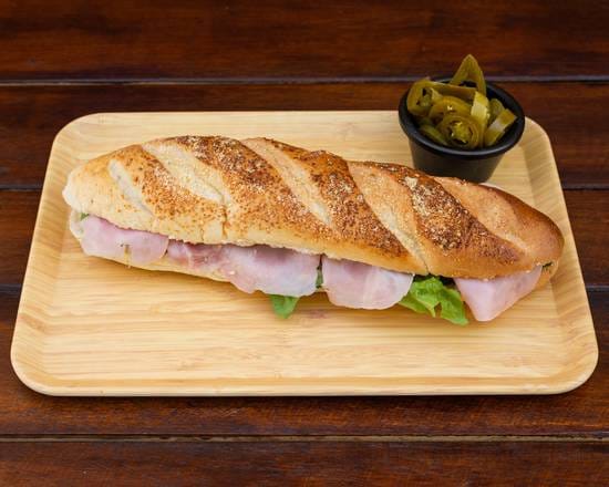 Pechuga ahumada de pavo gratinado con queso Oaxaca, panela, lechuga , pepino, zanahoria, aguacate, tomate y mayonesa.