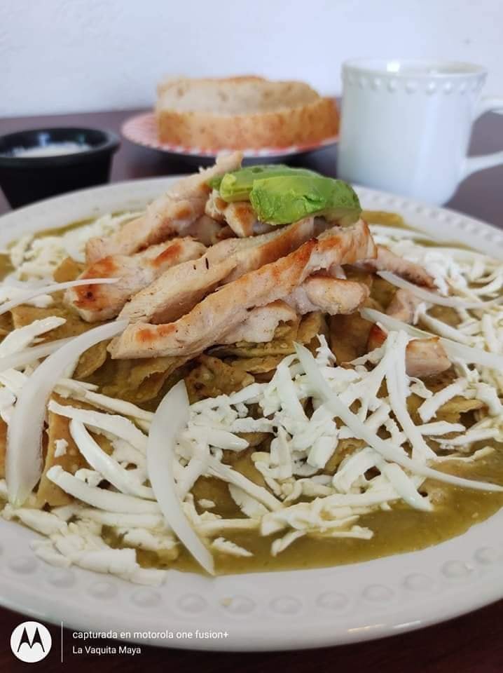 Deliciosos chilaquiles verdes, acompañado de proteína a elegir, queso panela y crema.