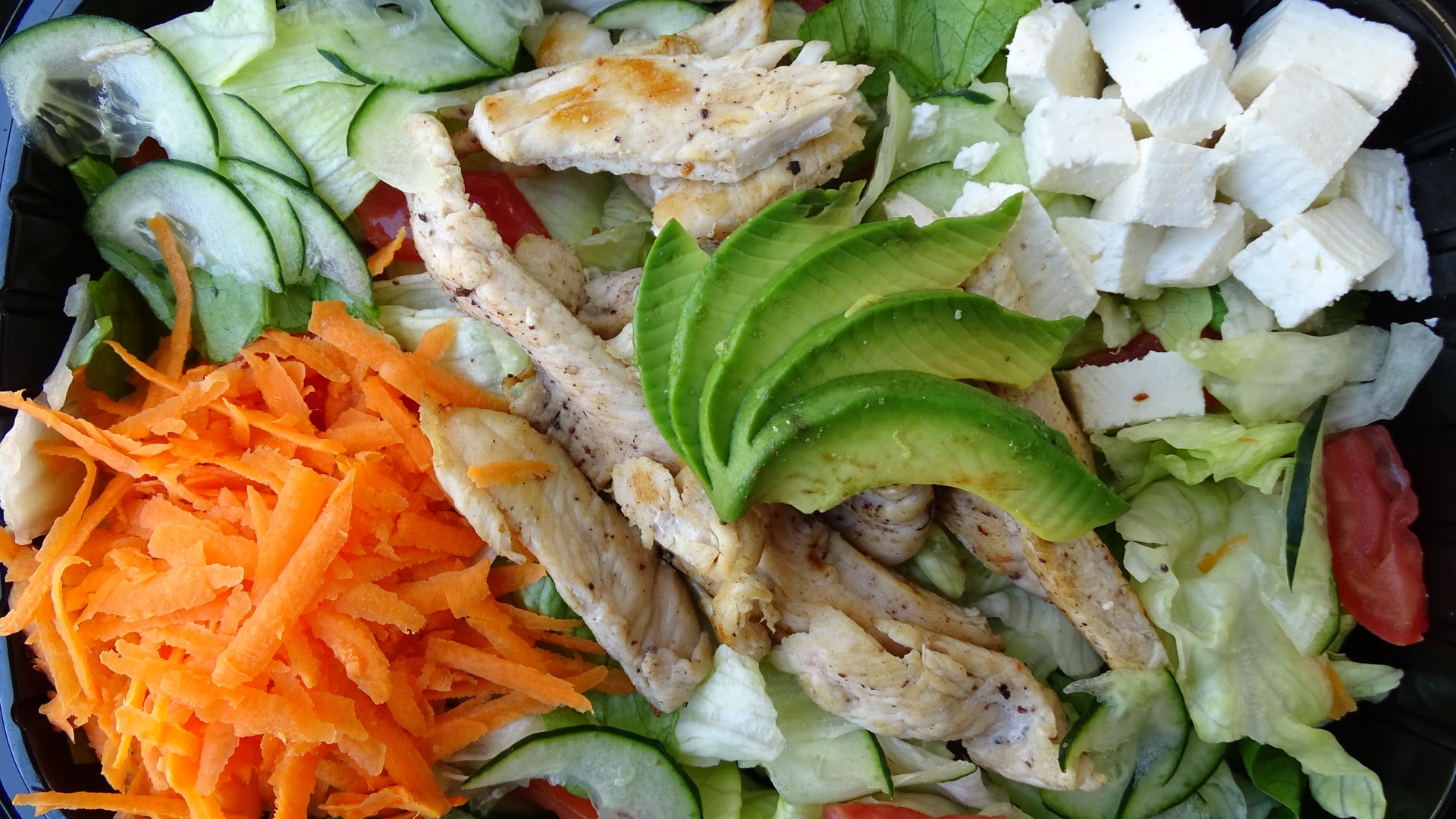 Ensalada de pollo a la plancha, lechuga, jitomate, aguacate, queso panela, zanahoria y queso panela.