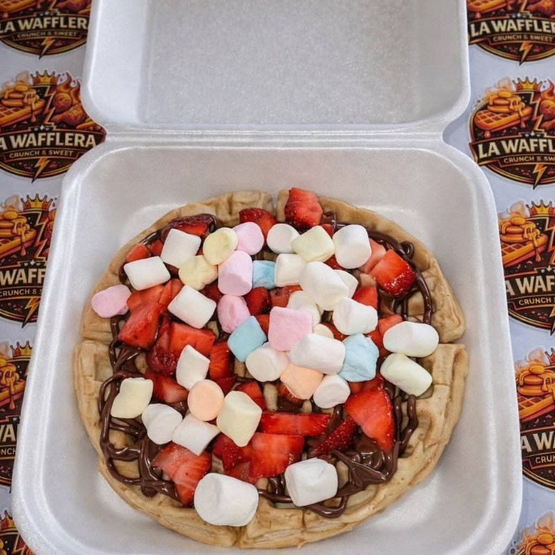 Waffle incluye base de queso Philadelphia, fresa natural, cubierta de Nutella y lechera.