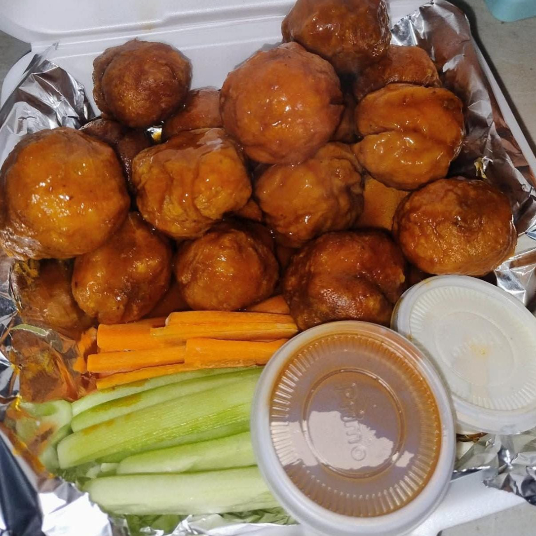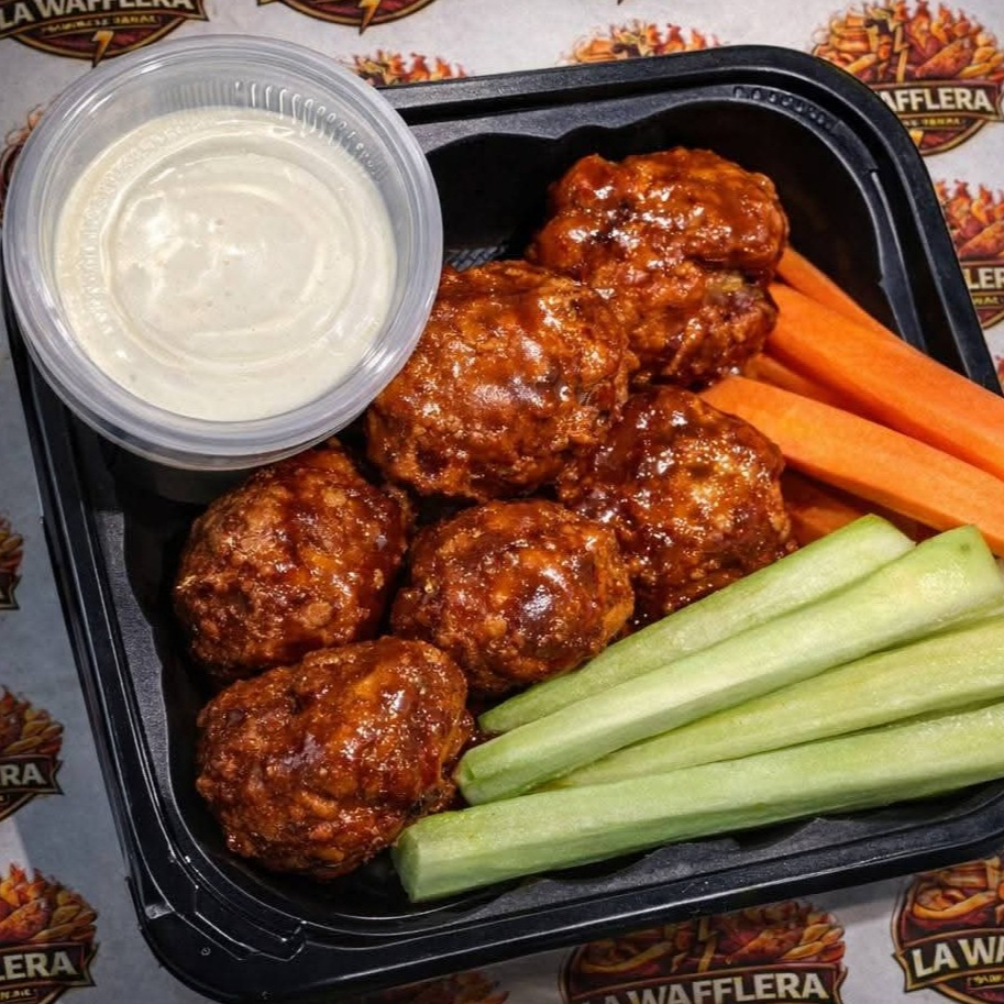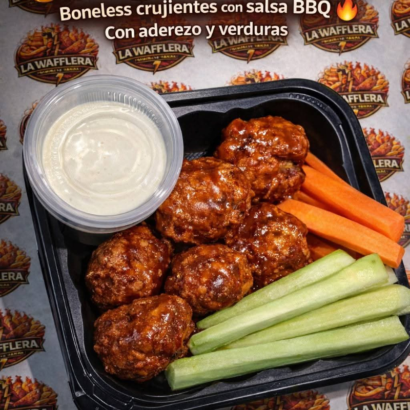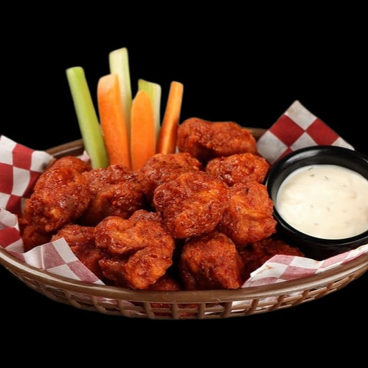 30 pzas De boneless, salsa a elegir, incluye aderezo crema de ajo, bastones de zanahoria y pepino.